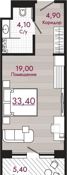 Общая площадь 33.4 м2