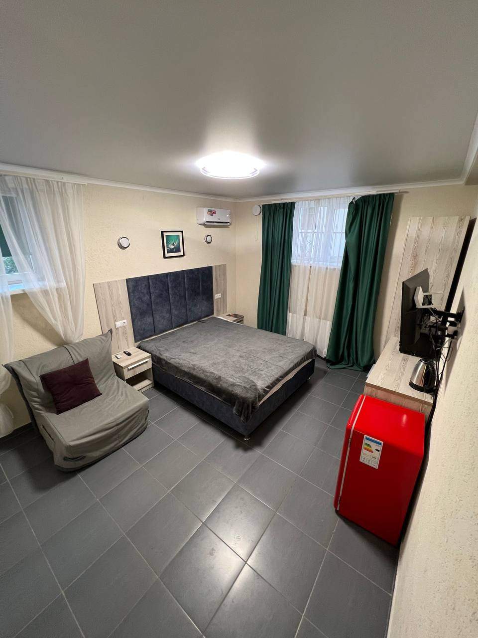 Три спальных места (двуспальная кровать + кресло-кровать). Шкаф для хранения вещей, тумбы, холодильник, кондиционер.