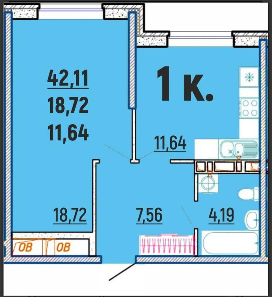 Общая площадь 42.11 м2
