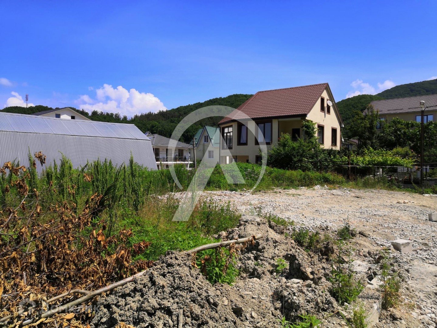 Участок, площадью 4 сотки  с прекрасным видом на горы выровнен и спланирован под застройку. Опорные стены вокруг участка  залиты с закладными под забор.