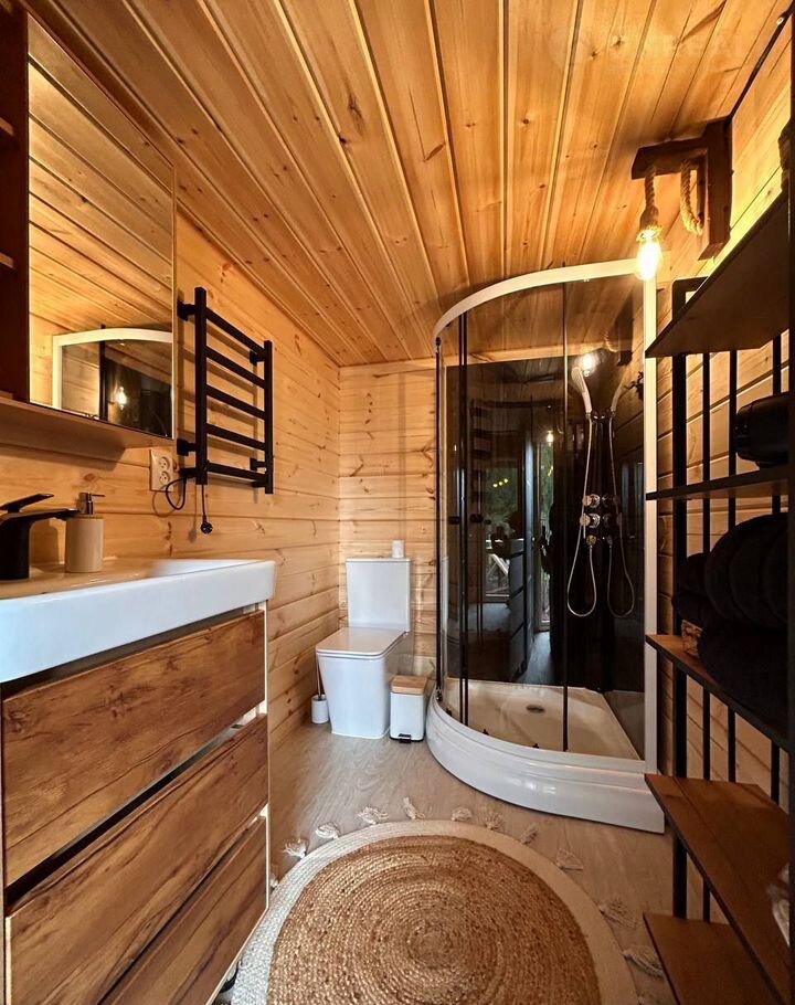 Душевая с санузлом, где есть все необходимое: душевая, унитаз, раковина, шкафчик, подогреваемая сушка, фен, 4 больших и маленьких полотенца, халаты, тапочки, дезодорант, гель для душа, шампунь/кондиционер.