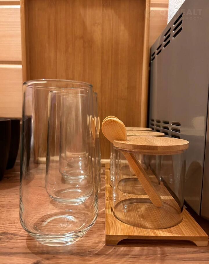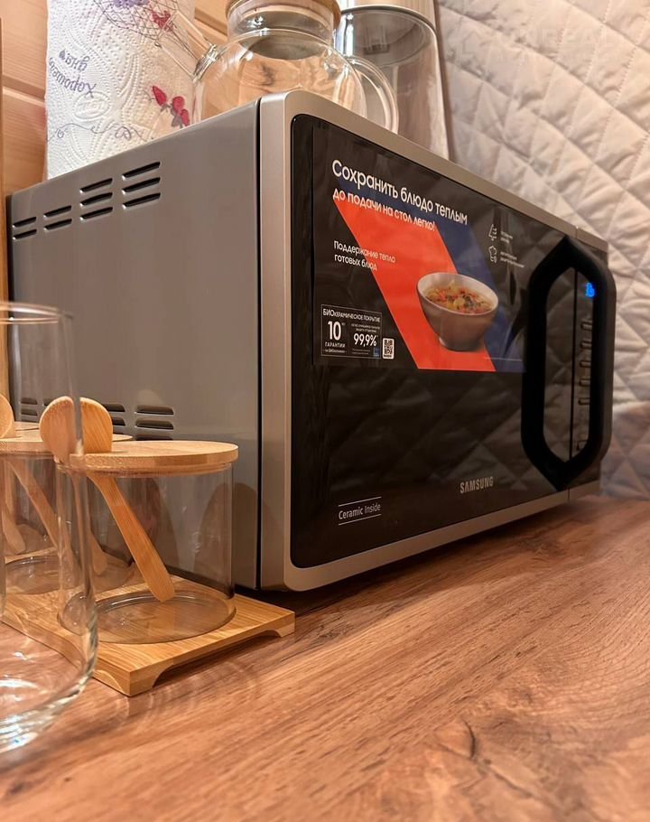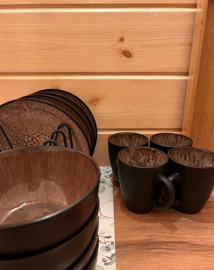 Кухонно обеденная зона со всем необходимым: столик с мягкими стульями, плита, раковина, холодильник с мини-баром, чайник, микроволновая печь, посуда: кастрюля, сковородка, чайные пары, чайник для заваривания, тарелки, бокалы, столовые приборы, ножи, алтайский чай и мёд в подарок;