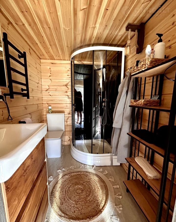 Душевая с санузлом, где есть все необходимое: душевая, унитаз, раковина, шкафчик, подогреваемая сушка, фен, 4 больших и маленьких полотенца, халаты, тапочки, дезодорант, гель для душа, шампунь/кондиционер.
