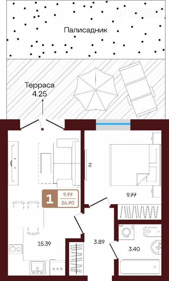 Общая площадь 36.7 м2
