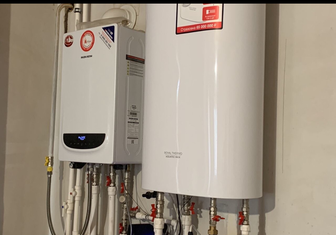 Котел одноконтурный Навьен + Бойлер косвенного нагрева + насос обратного хода. В санузле ванная, унитаз, радиатор.