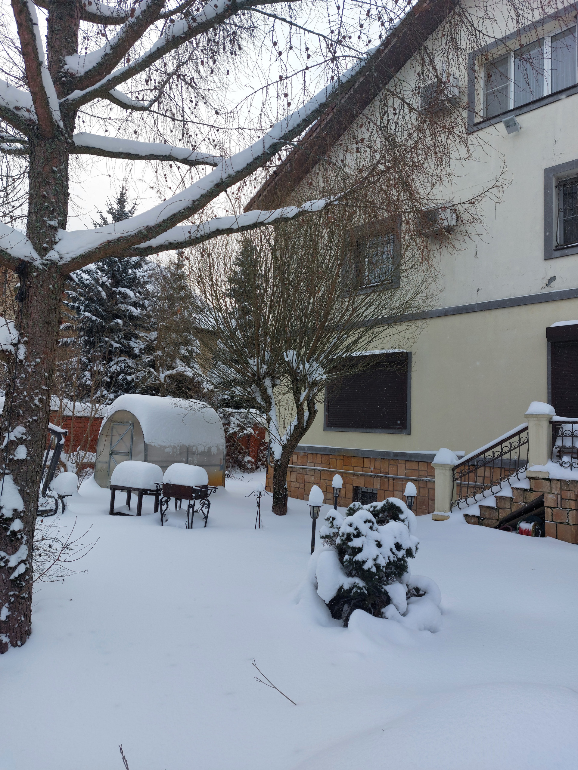 Участок ухоженный, правильной формы. На нем растут пихты, сосны и ели, а также плодоносящие деревья.