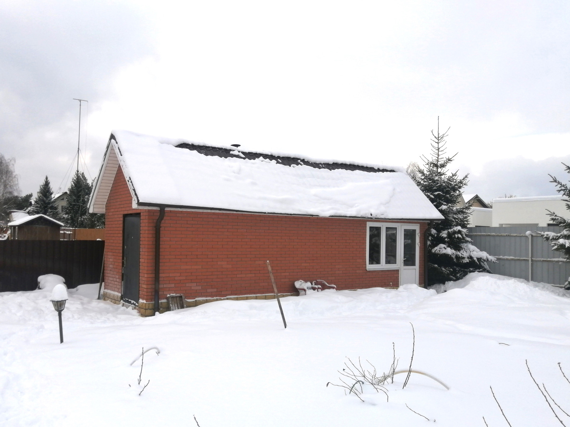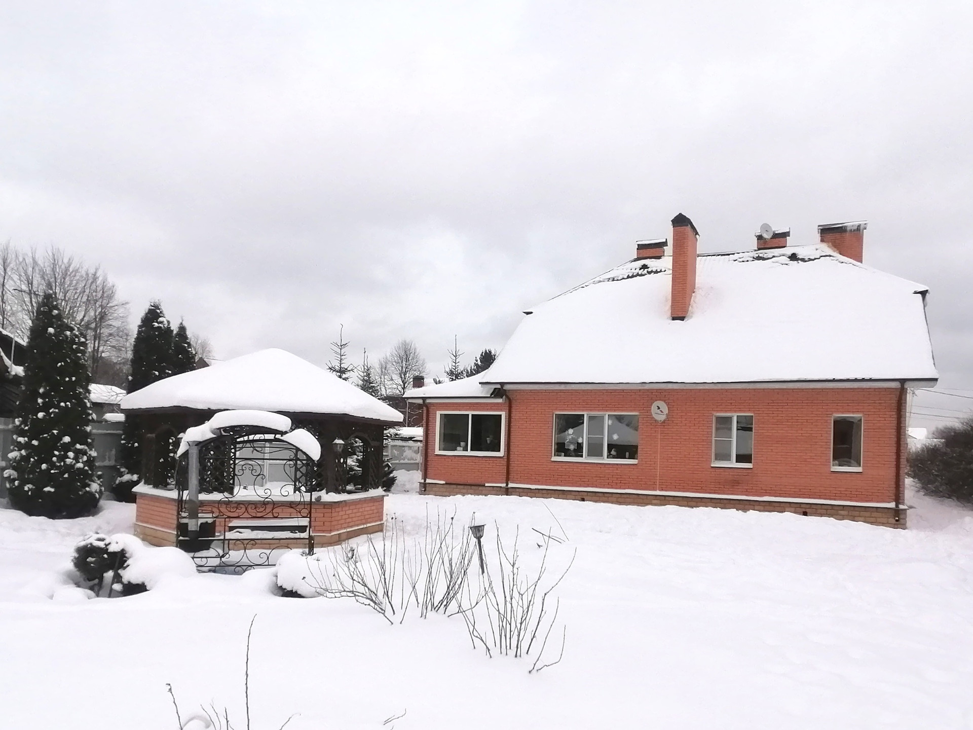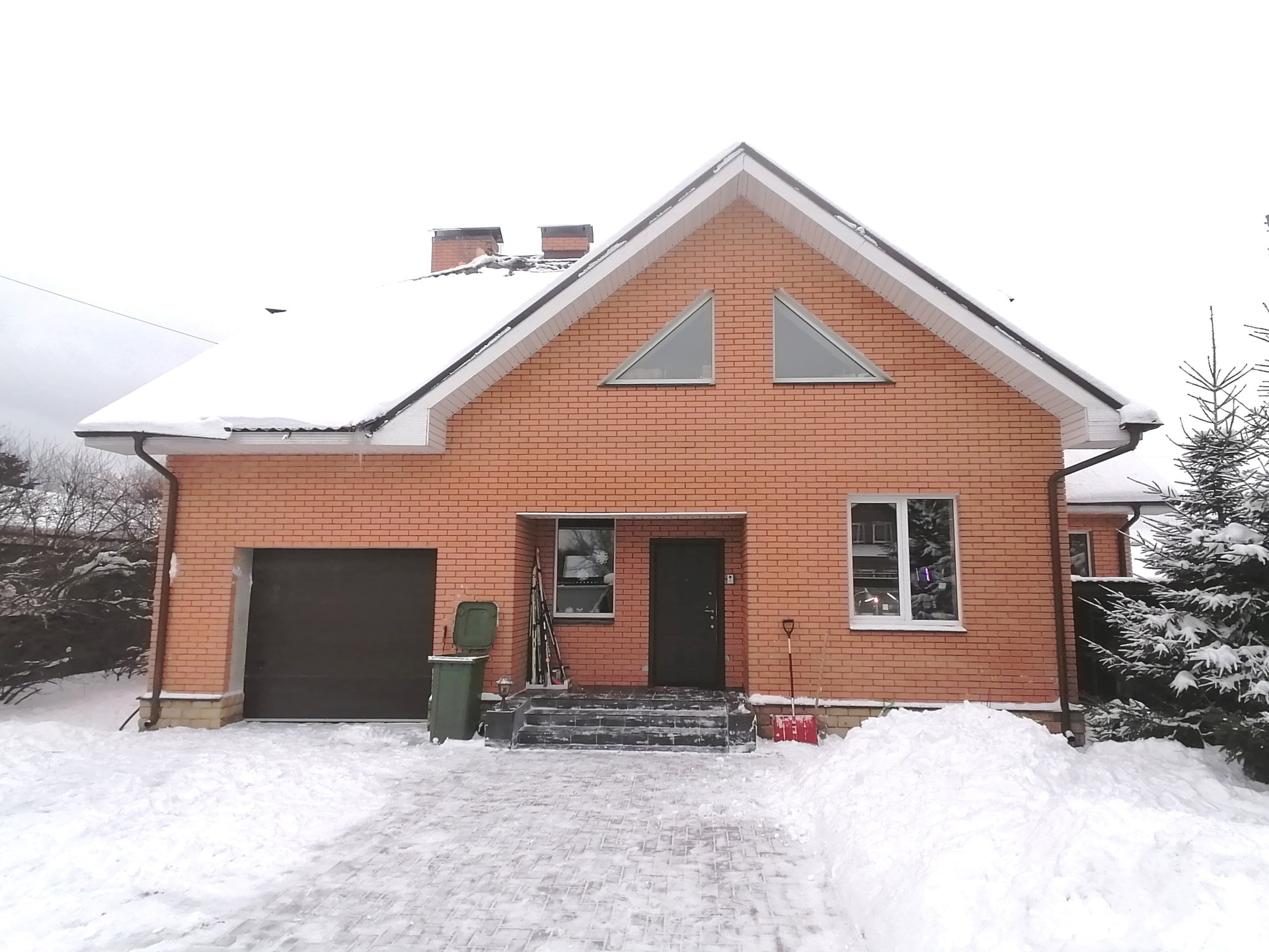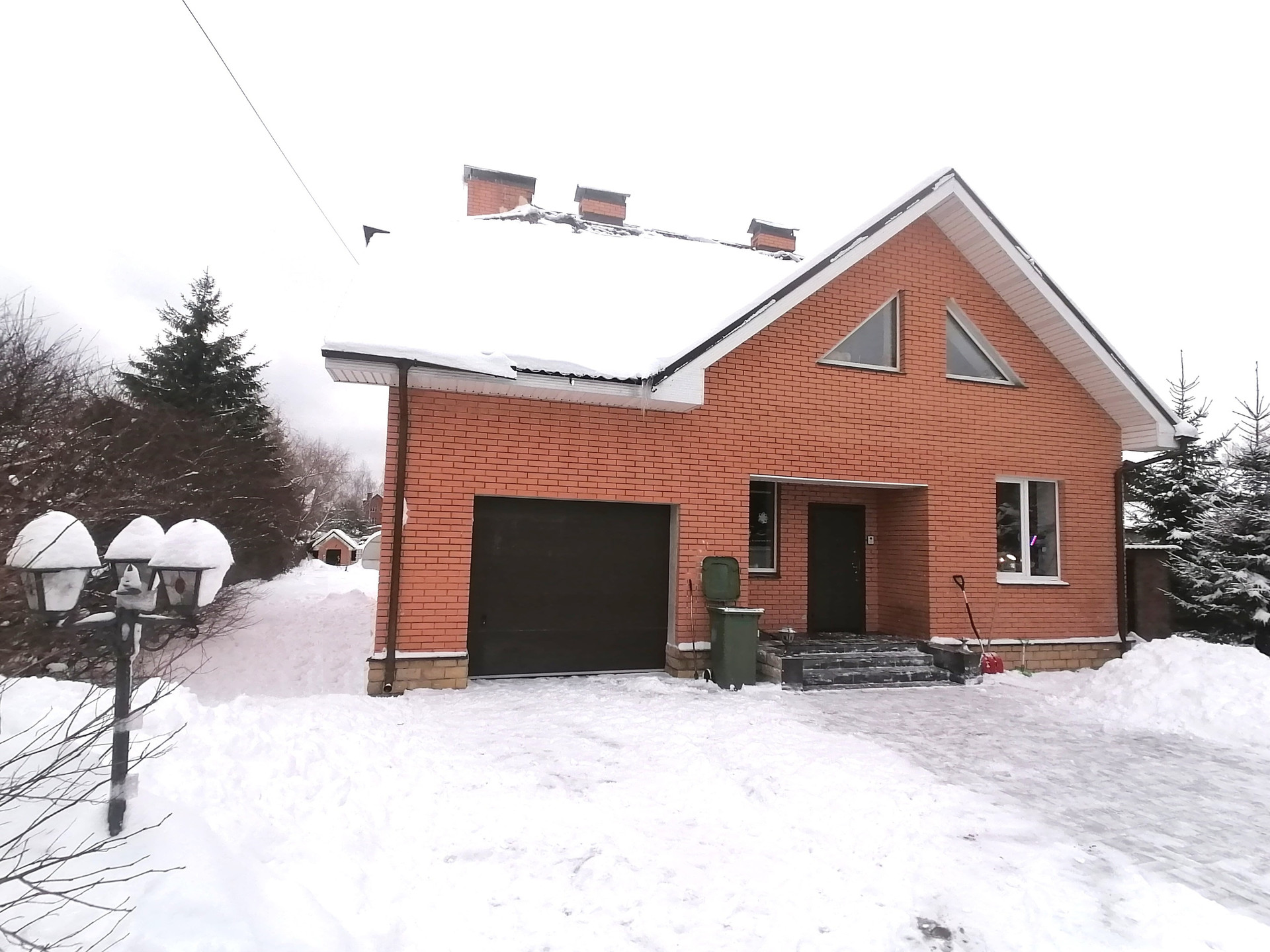 Коттедж построен в 2008 году. Стены сложены из пенобетонных блоков, утеплены и облицованы кирпичом, кровля – металлочерепица.