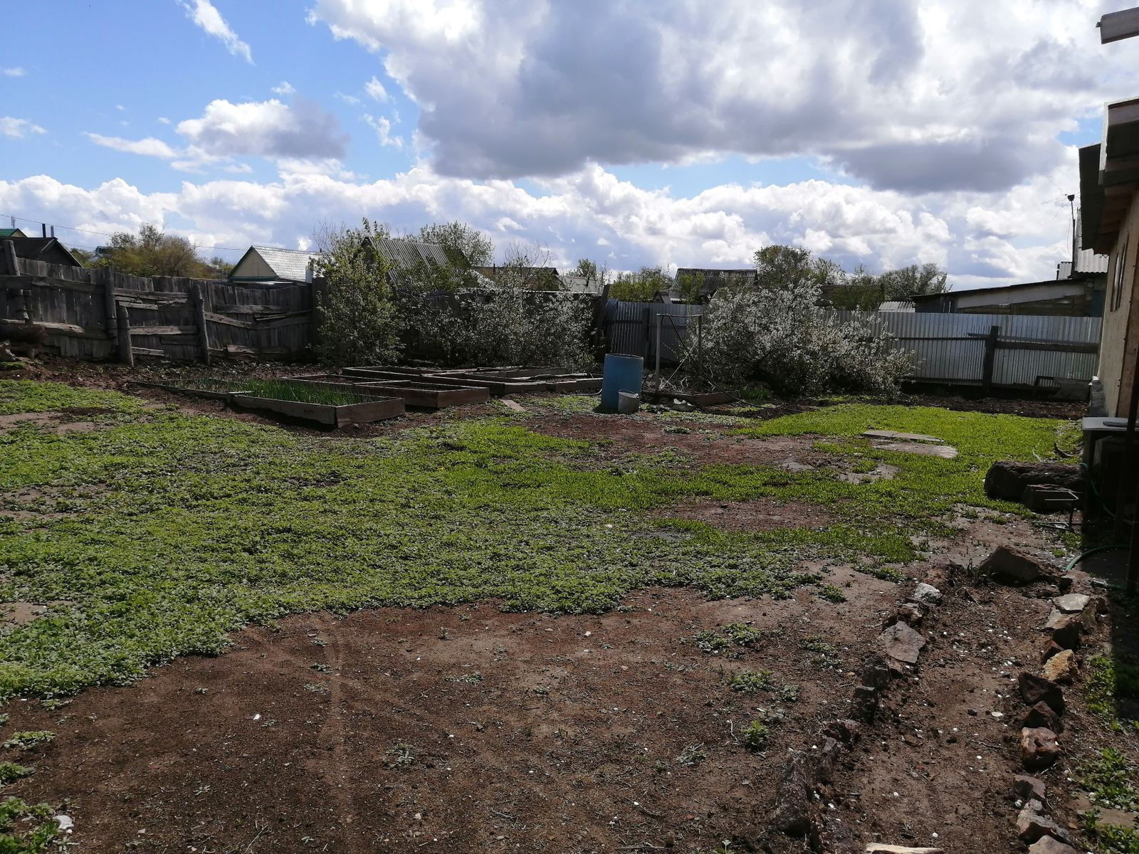 Ухоженный огород. Плодово-ягодные насаждения: виноград, клубника , кусты смородины, вишня, груша, черемуха.