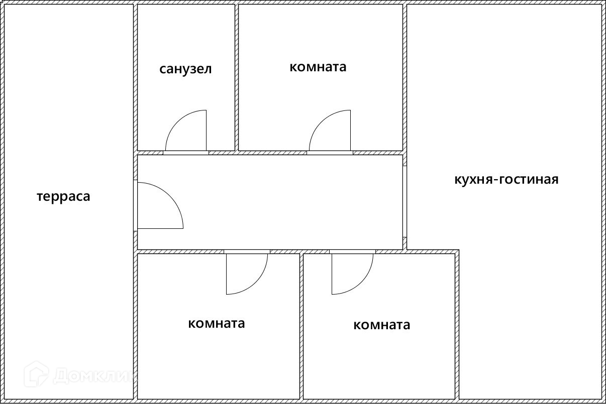 Входная группа, просторная прихожая ,кухня-гостиная, три спальные комнаты, санузел.