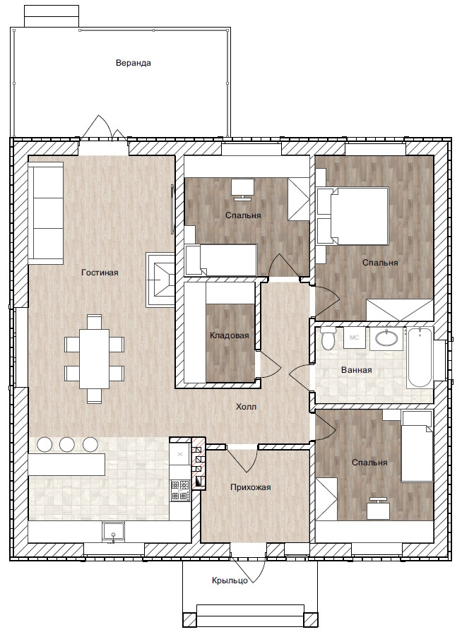 Планировка 3 спальни, просторный с/у, кухня-гостинная, гардеробная, прихожая, большой чердак. Из гостинной выход на веранду.