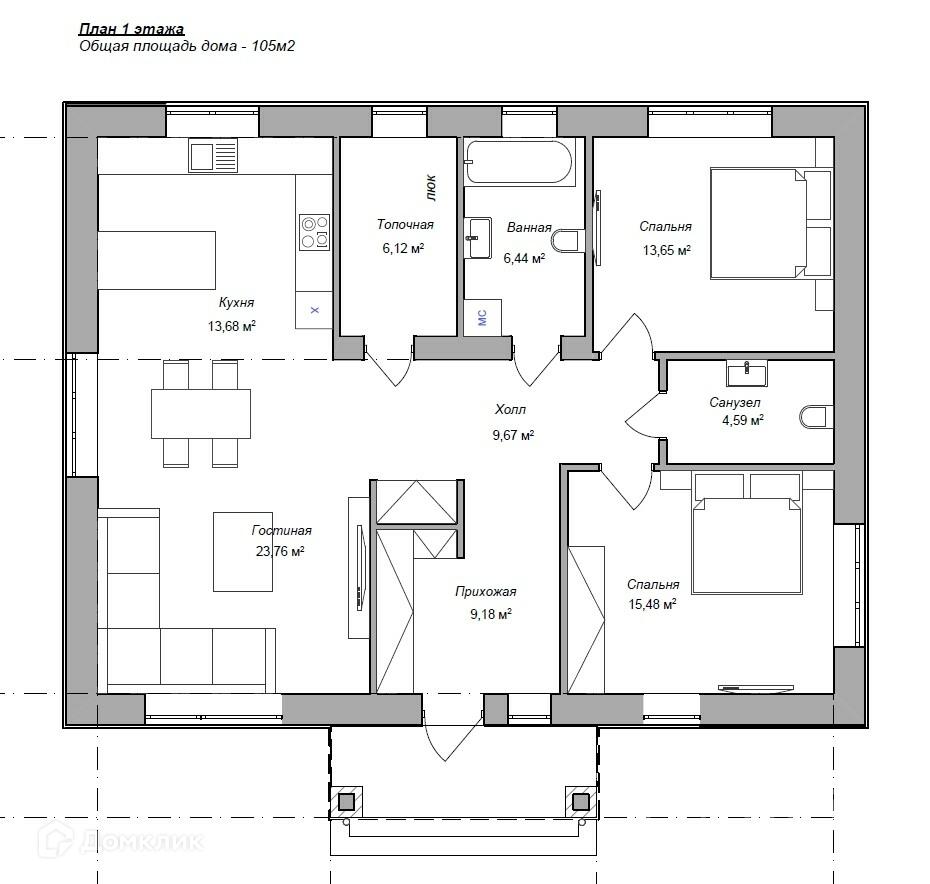 Из холла непосредственно есть доступ в зону кухни-гостиной площадью (13,68 (зона кухни) + 23,76 (гостиная) ) 37,44 кв.м.