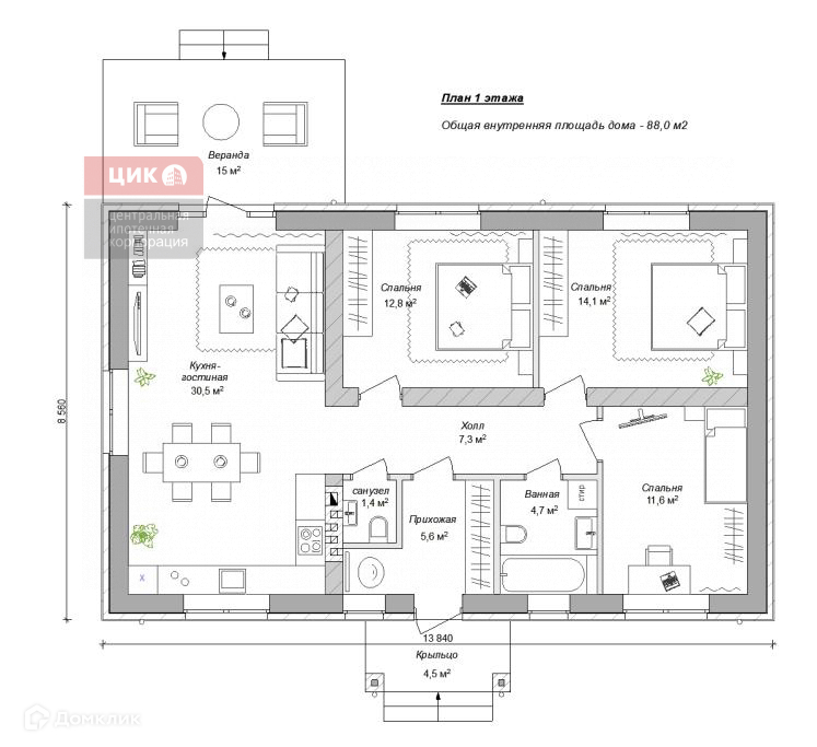 Площадь дома без веранды - 88 кв.м.:
