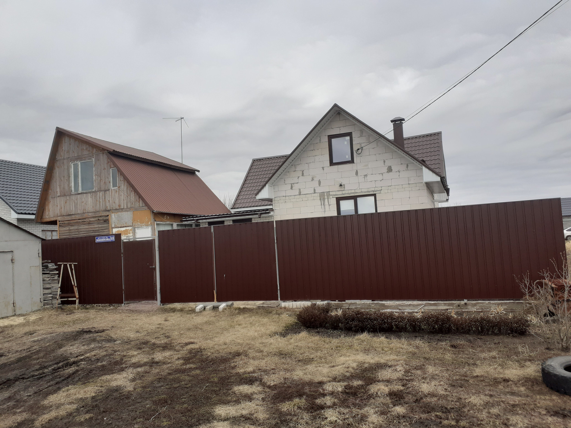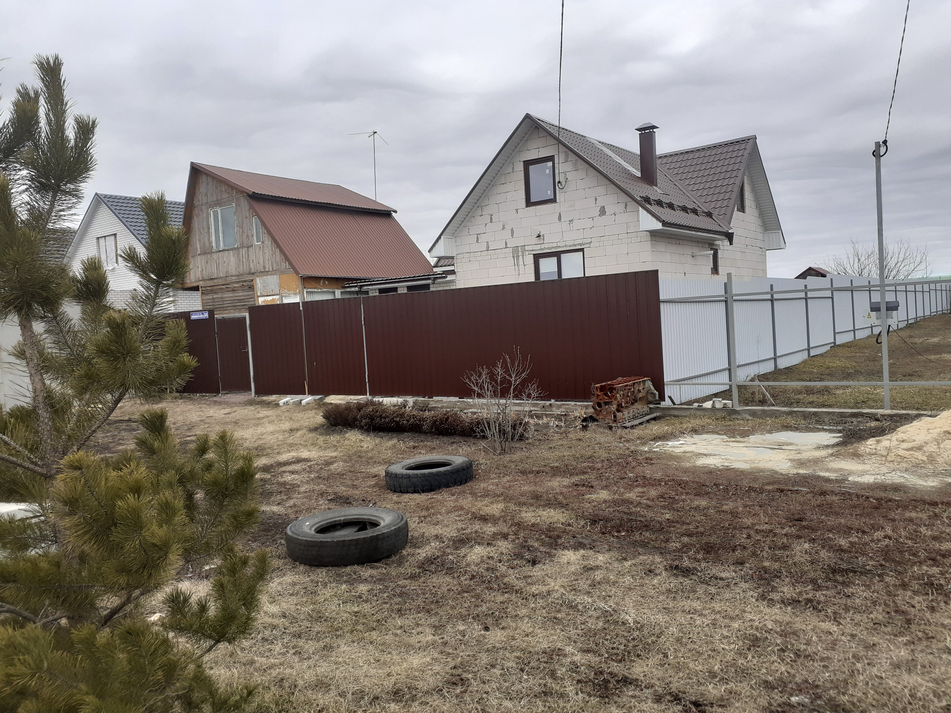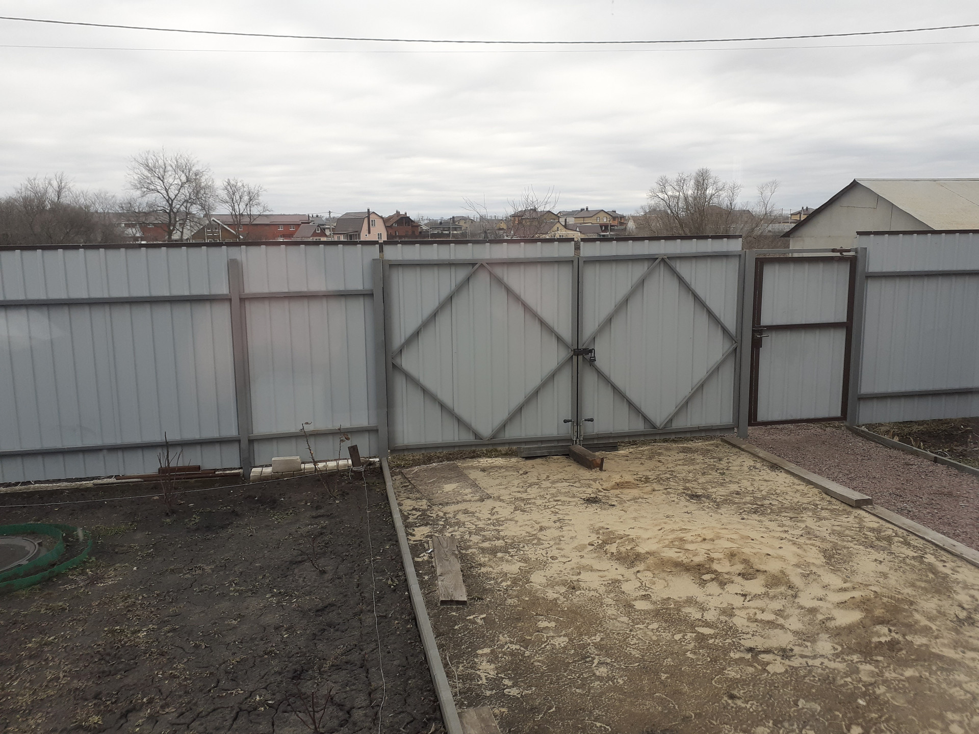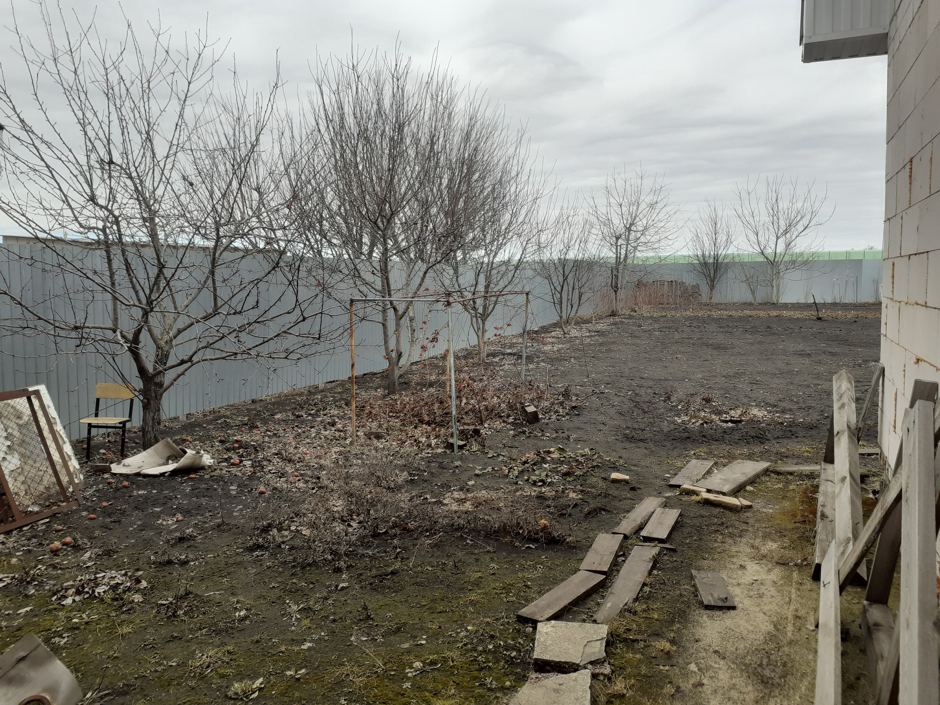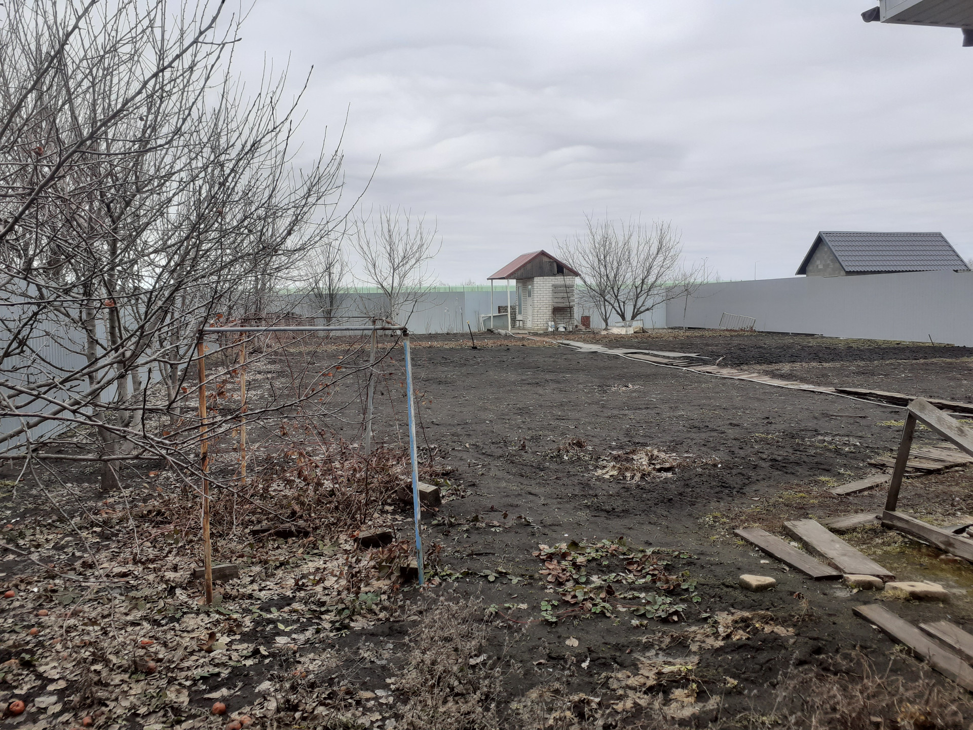 На участке забор по периметру, большой огород, молодой сад, перед домом металлический гараж.