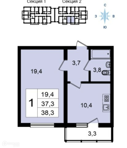 Общая площадь 38.3 м2