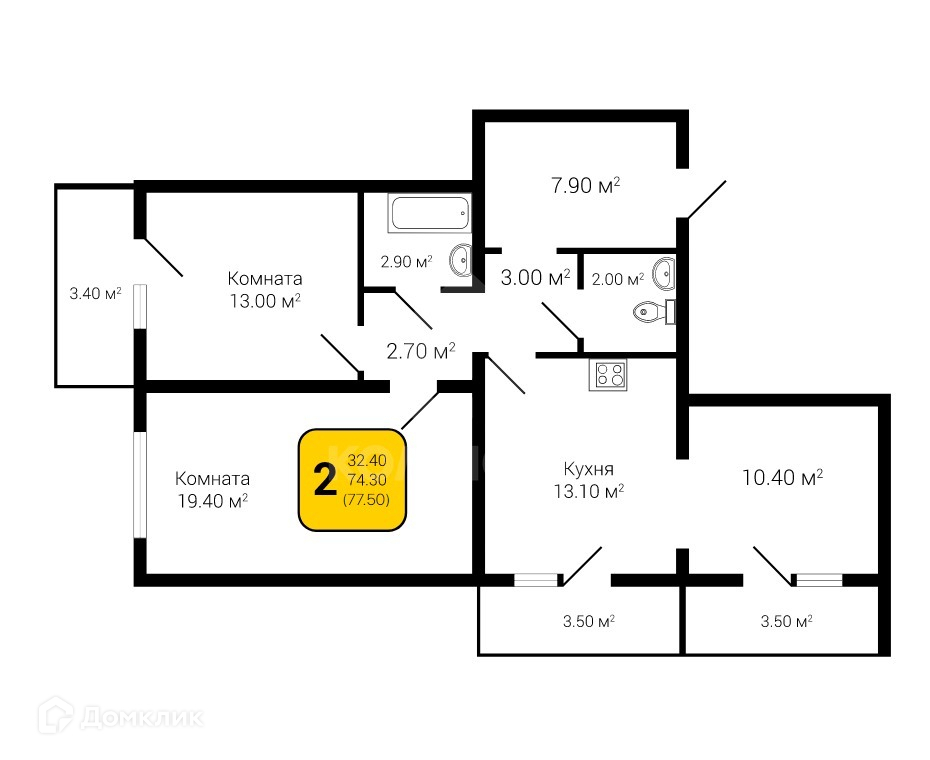 Общая площадь 77.5 м2