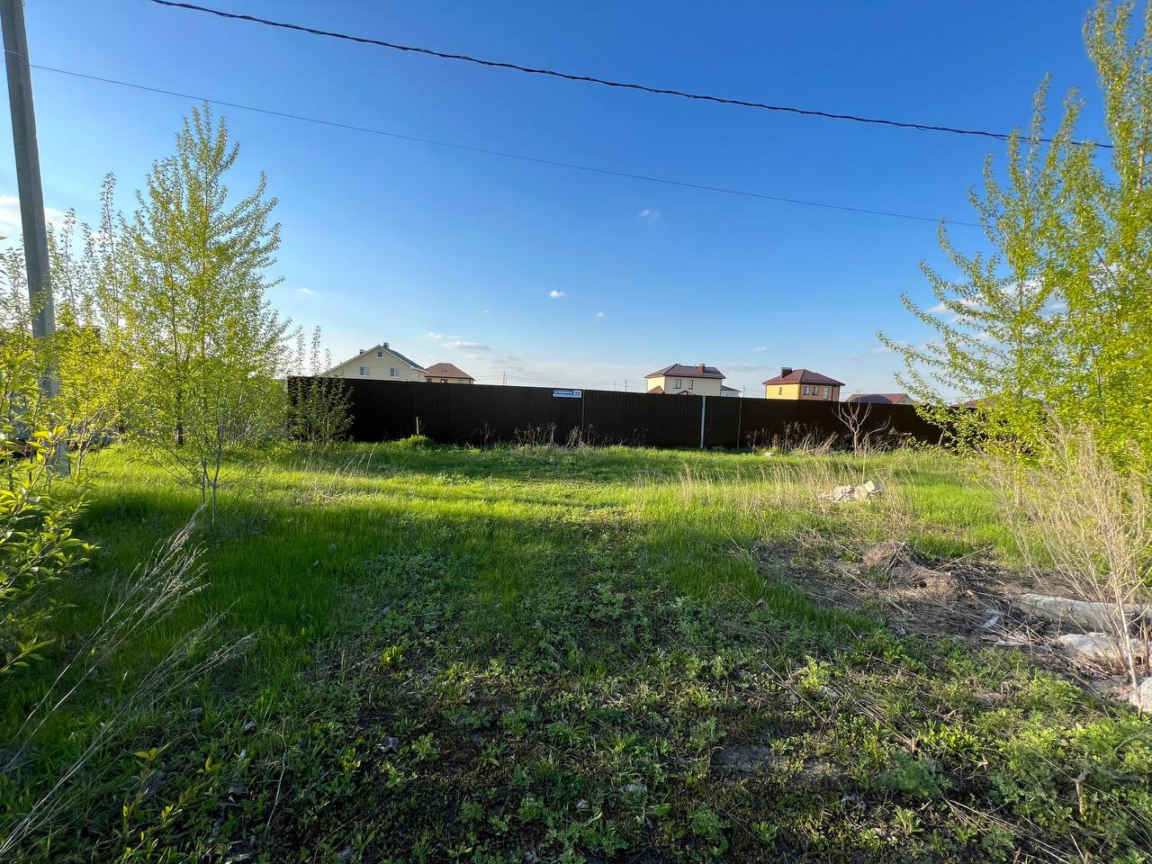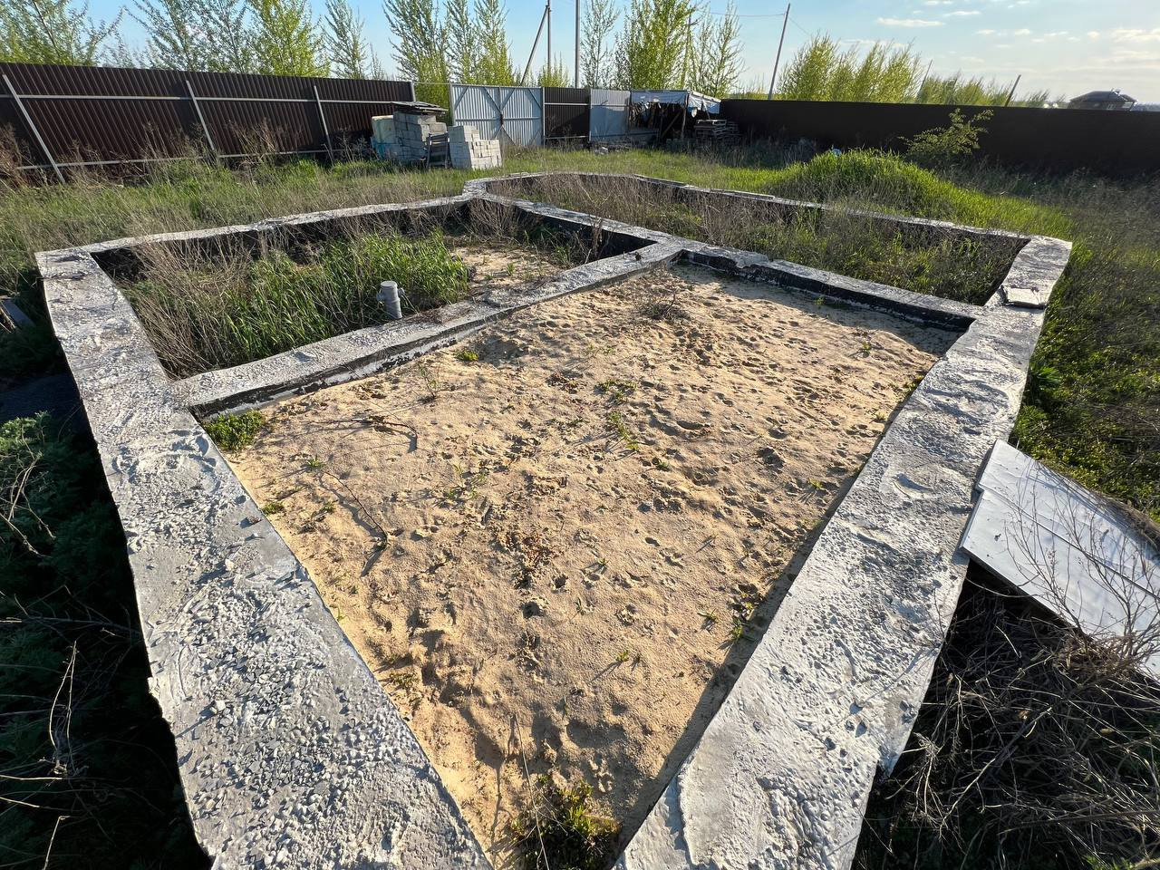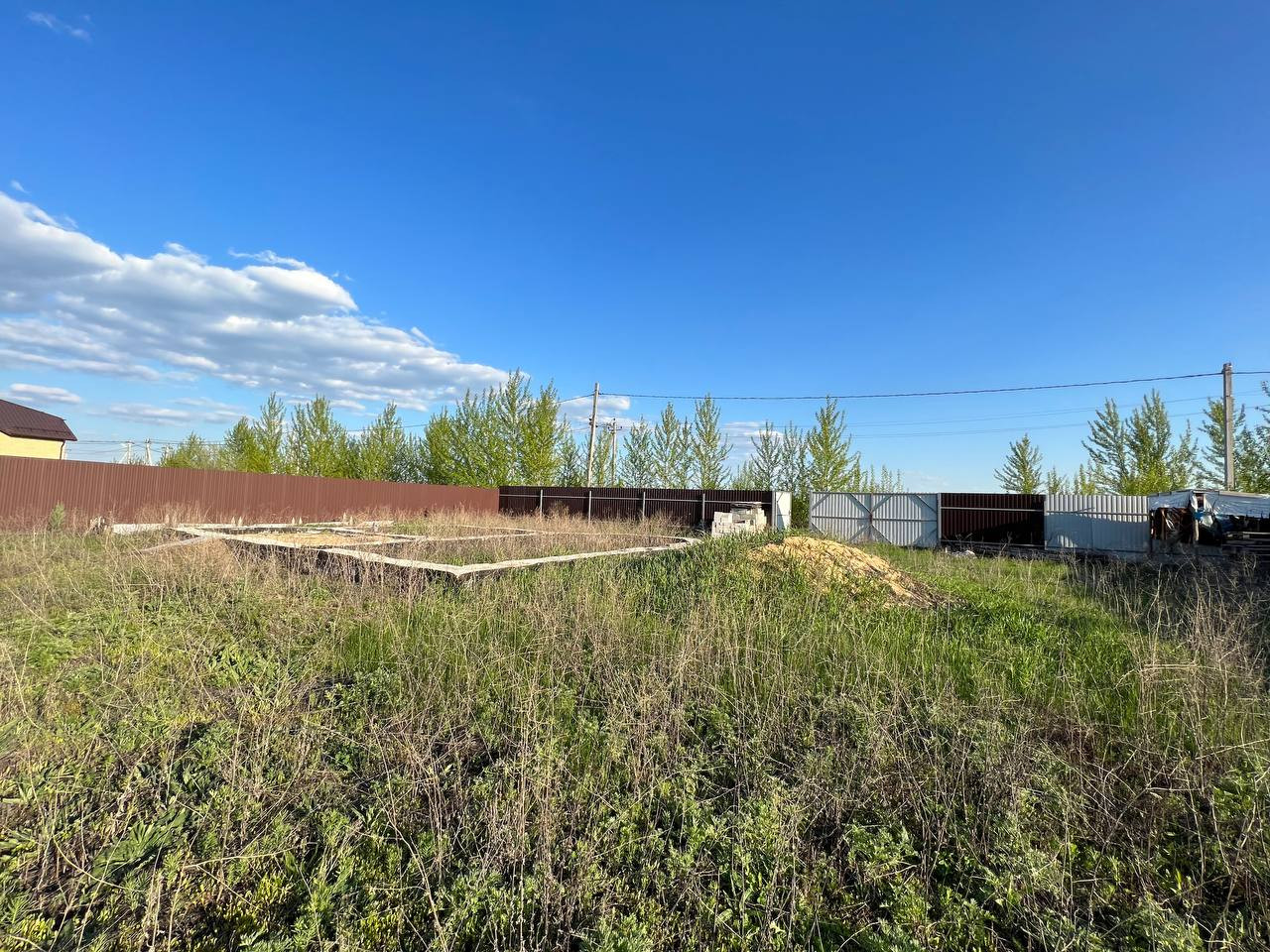 На участке есть фундамент и септик, полностью огорожен металлопрофилем, участок ровный