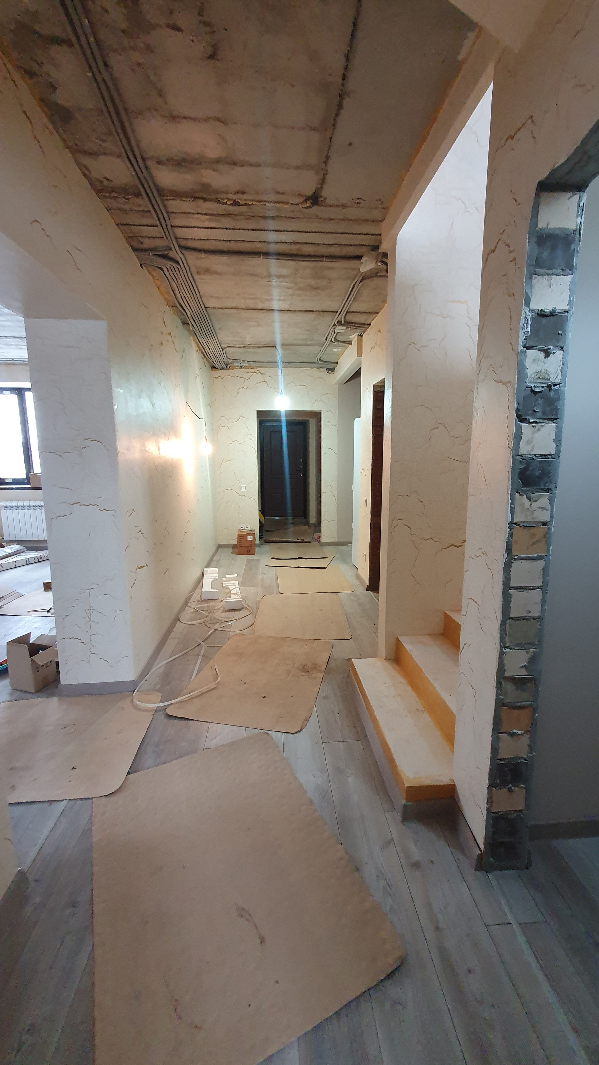 На второй этаж ведёт монолитная лестница с коваными перилами, дубовый шпон на ступенях.