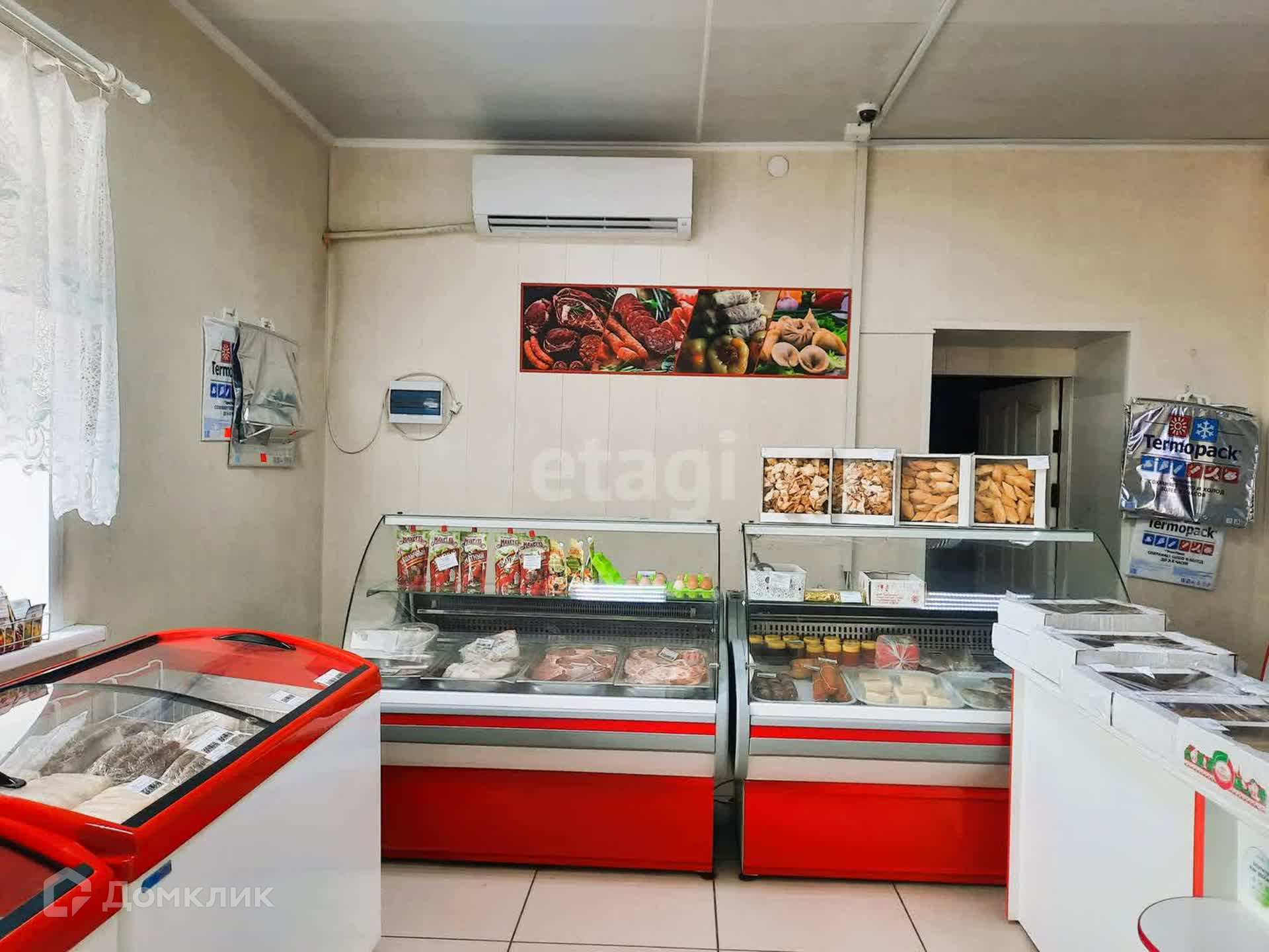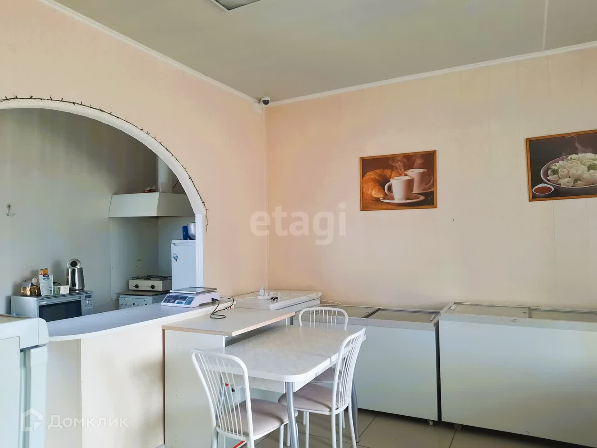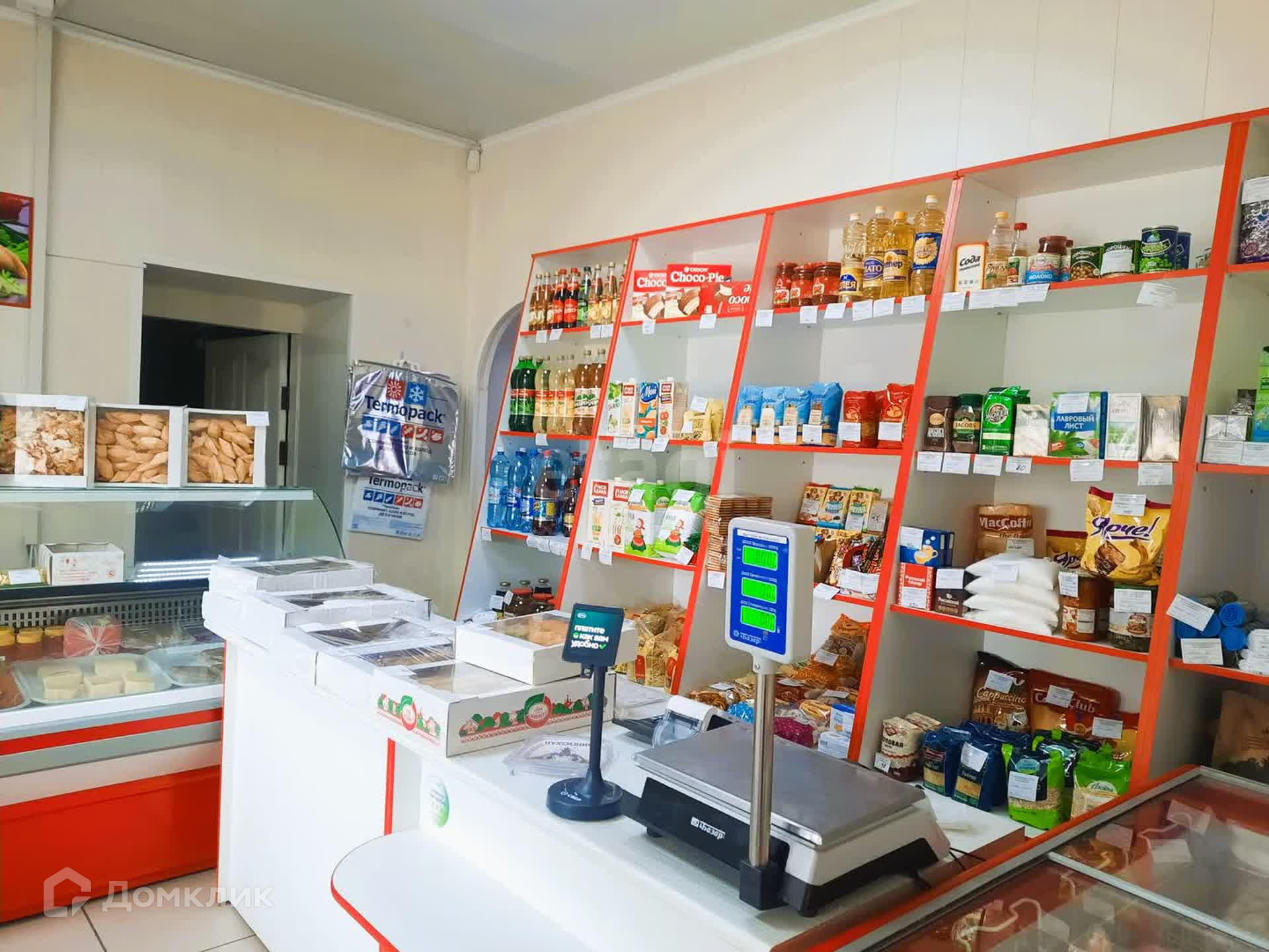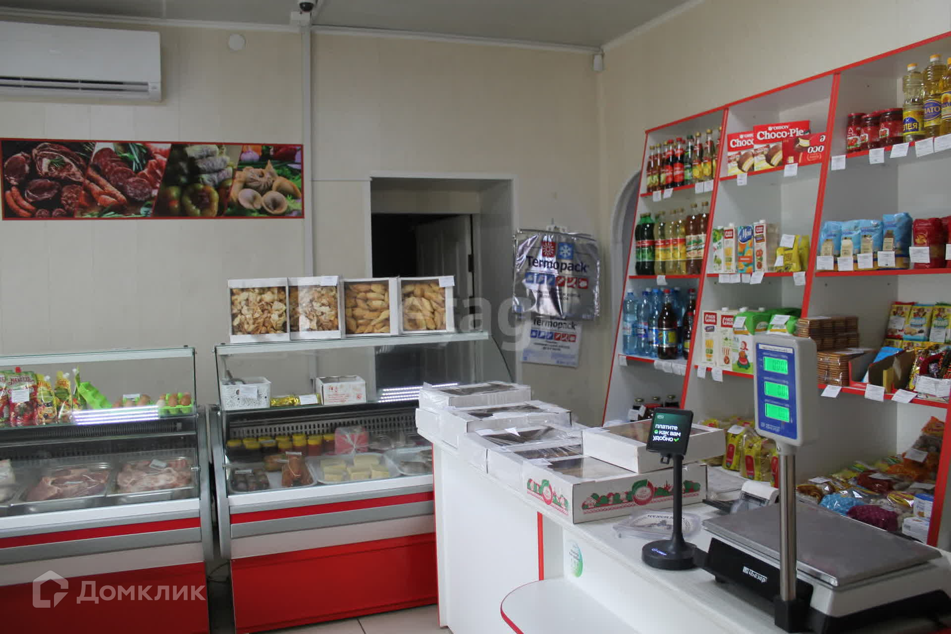 Здание имеет два зала, одно из которых используется как продуктовый магазин, другое - как кафе быстрого питания. Общая площадь составляет 75 кв.м. Есть и вспомогательные помещения, склад, санузел. Два входа: основной и для разгрузки. В стоимость входит всё торговое оборудование: промышленная морозилка около 300 литров, торговые холодильные лари, прилавки, промышленная мясорубка, тестомес и т.д.