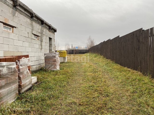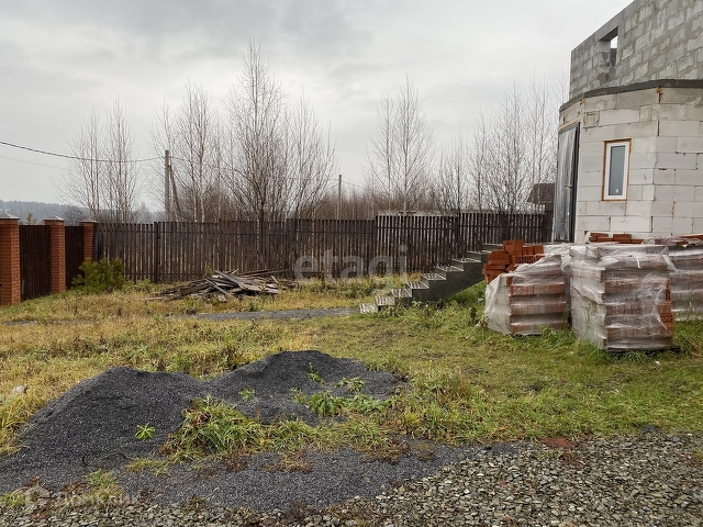 Толщина ленты 40 см. углублена на 30 см в землю. Фундамент рассчитан на кирпичный 2-3 этажный дом. Стены выложены по ГОСТу с армированием каждого 4 -ого ряда арматурой 10 мм. с обвязкой по углам на каждую сторону по 30 см. Межэтажное перекрытие плиты 22 см. Полы по грунту армированы залиты бетонной стяжкой толщиной 10 см. Материал стен не требует утепления только отделка второго этажа, первый этаж блоки с фасадом рваный камень. Участок огорожен двухметровым деревянным евроштокетником, ворота распашные.