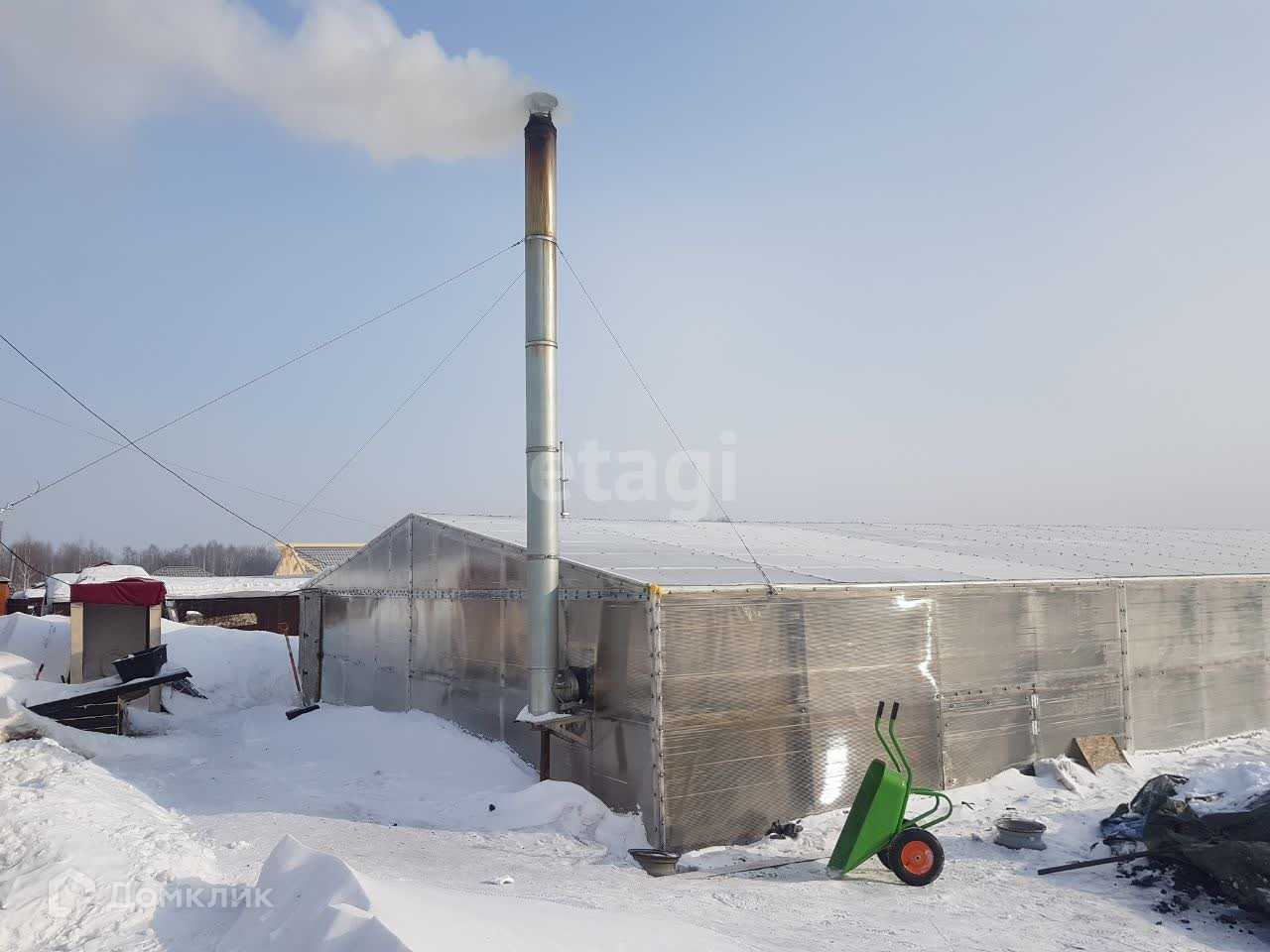 Также на территории имеются холодильники, сливная система, электричество, централизованное водоснабжение, газ подведен к границам участка, интернет. В данный момент теплица отапливается и функционирует.
