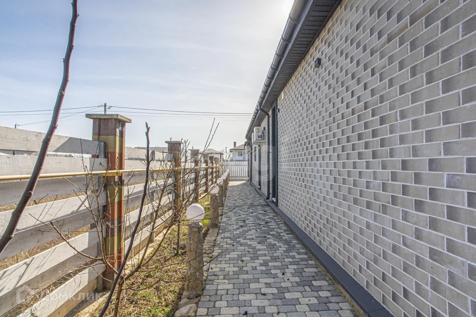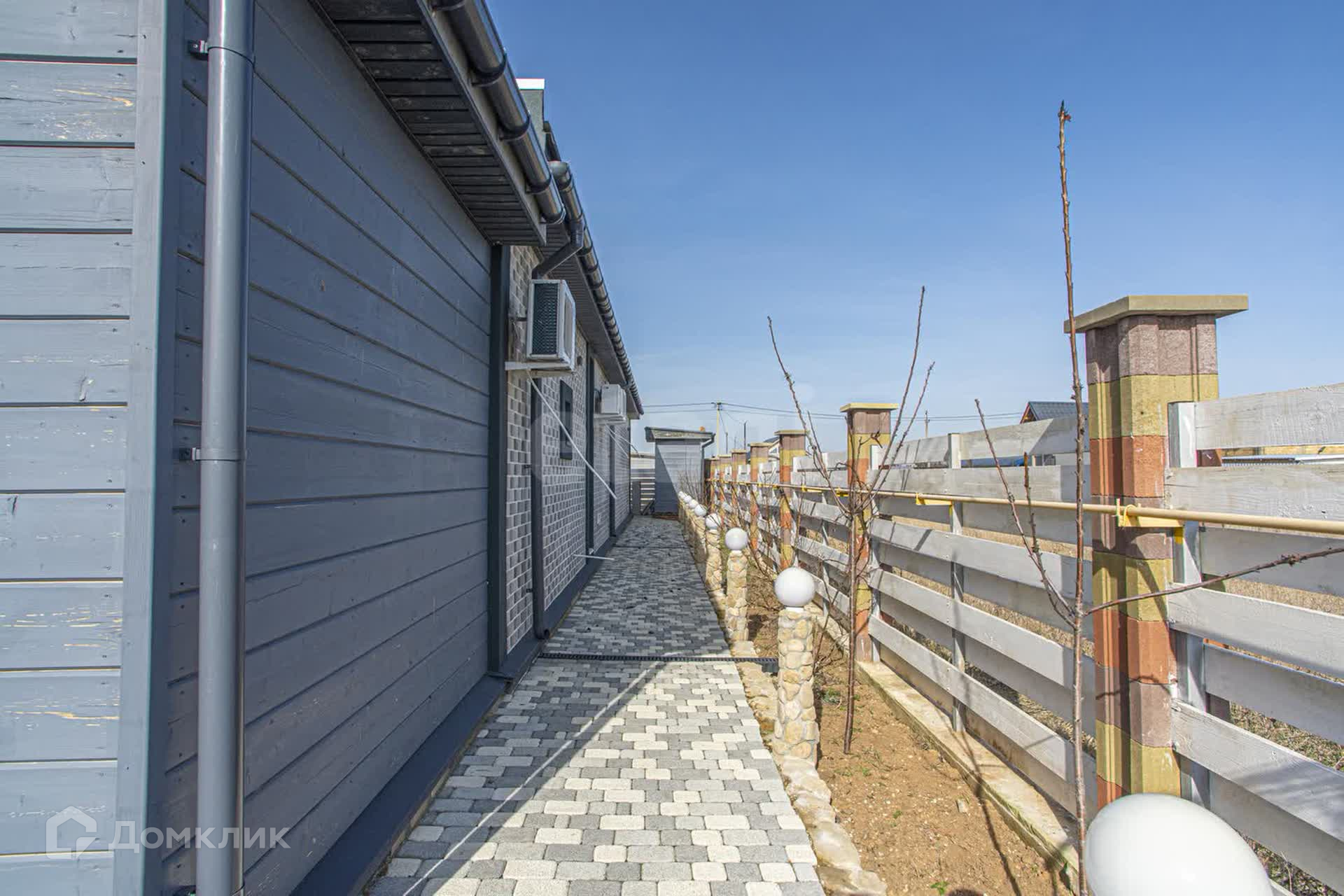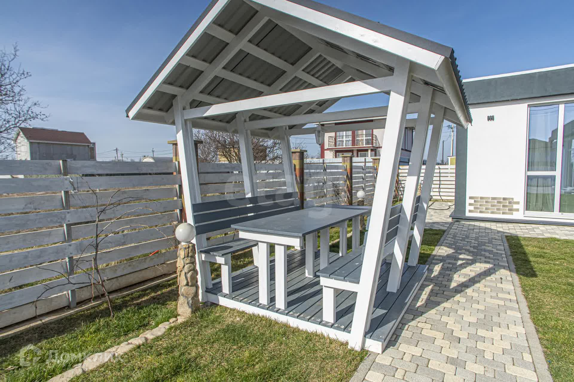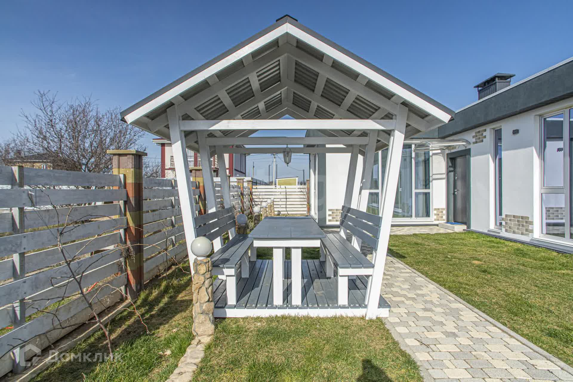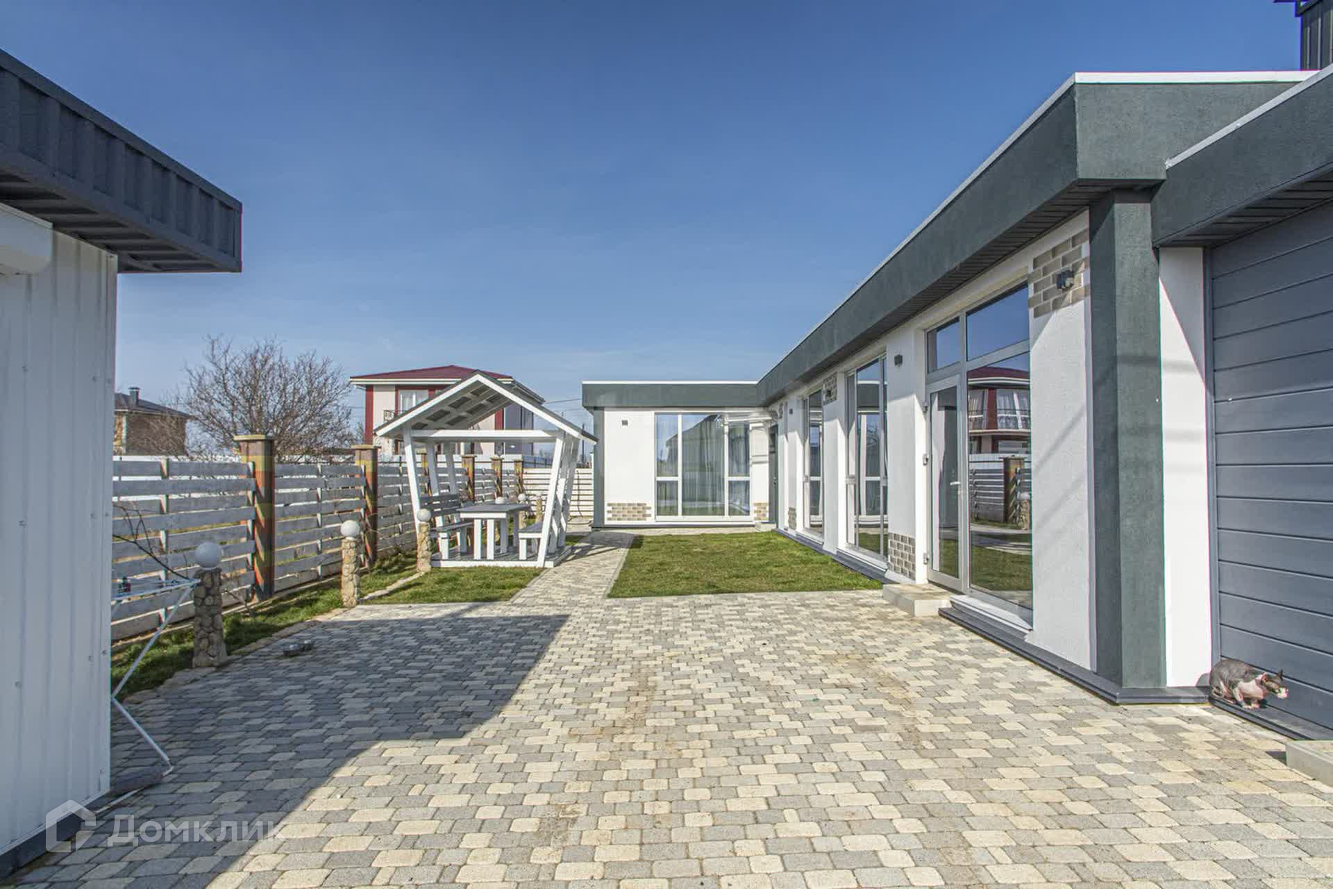 Во дворе находится беседка, участок облагорожен плиткой и высажен газон.