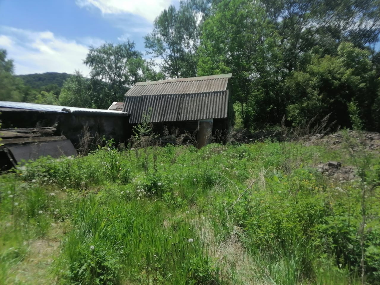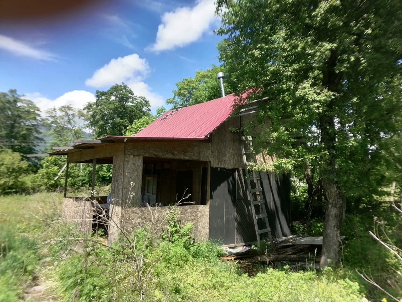 На участке небольшой домик с верандой, отопление твердотапливаемое, стол, кровать, умывальник. Также есть сарай под инструменты. Часть участка отсыпано скалой, планировали выливать фундамент под дом.