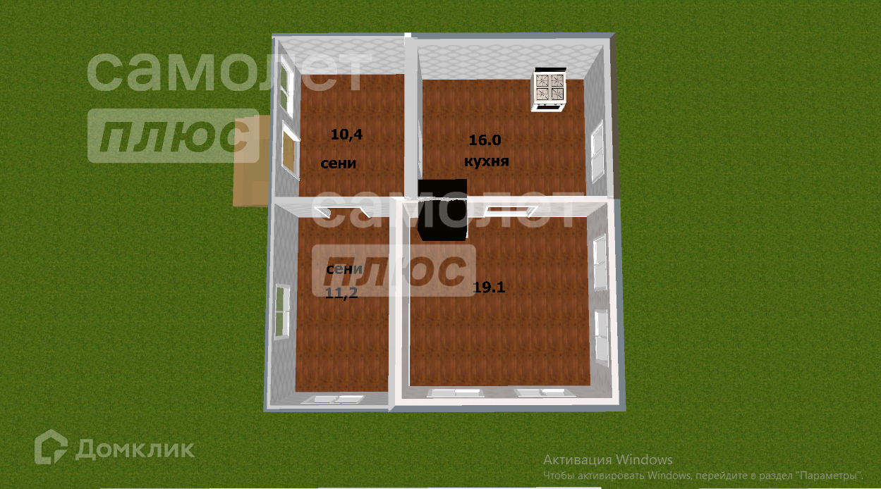 Общая площадь дома 35,9 м кв., а с учетом сеней площадь составляет 56м, участок — 12 соток.