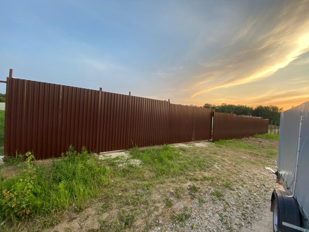 Сделан забор из проф листа цинк бока и зад лицевая сторона коричневая также сделаны откатные ворота и проведён закладной провод сечением 3.2,5 в пнд трубе на электро привод
