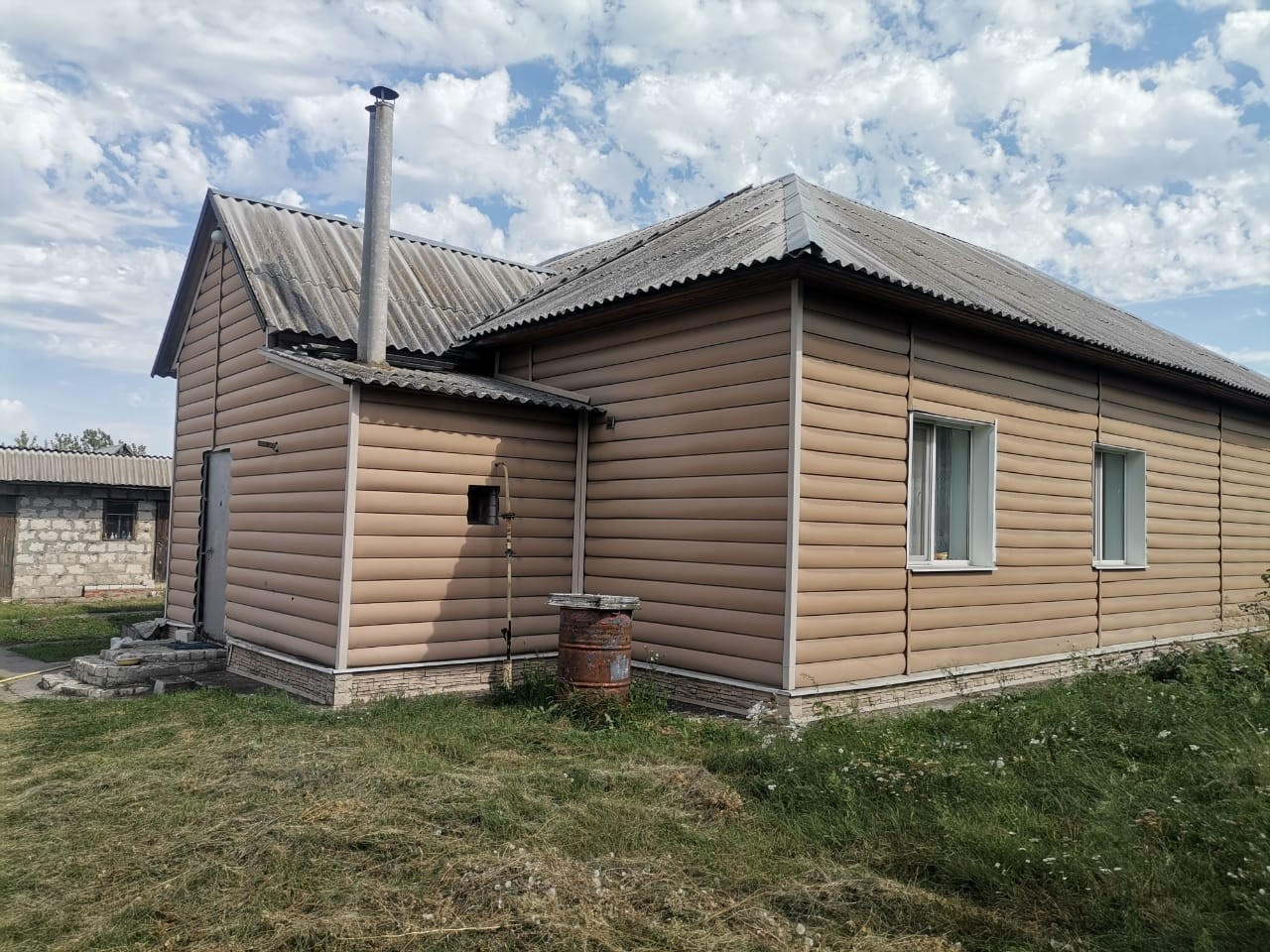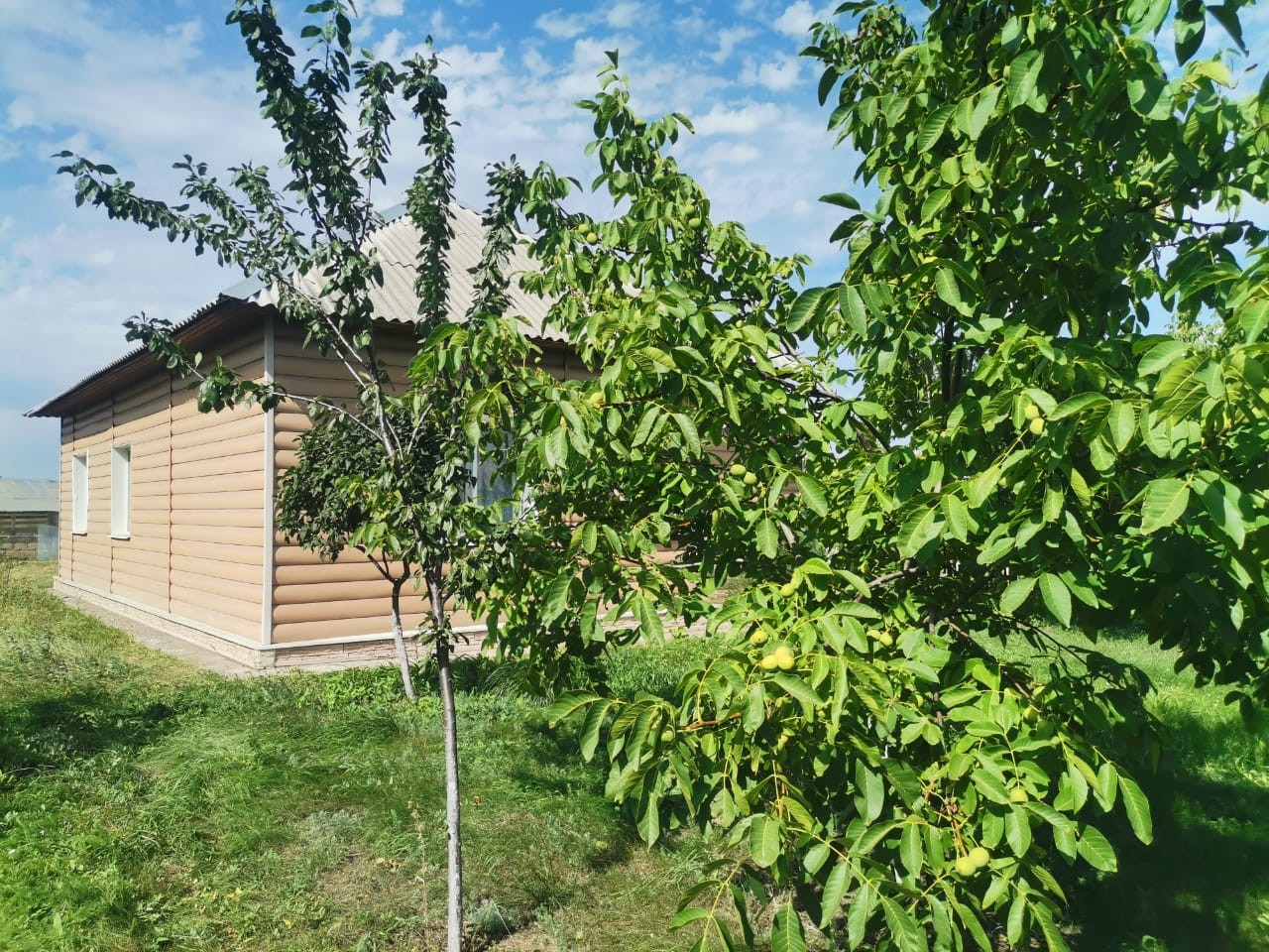 Одноэтажный жилой дом, газоблок, облицован кирпичом, вымота потолков 3.05 м, обшит сайдингом, окна ПВХ, санузел, горячая вода, отопительный котел, септик, забор, на территории три сарая, гараж с подвалом, но без крыши, теплица 24м2, баня, летний душ, вольер для собаки, плодовые деревья (грецкий орех, яблоня, сливы, груша, черешни, вишни). Участок 51 сотка. Один собственник. Возможна продажа в ипотеку, с использованием материнского семейного капитала, подходит под сельскую ипотеку от 3%. Агентствам не беспокоить.
