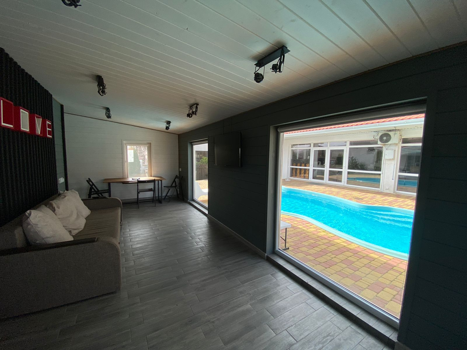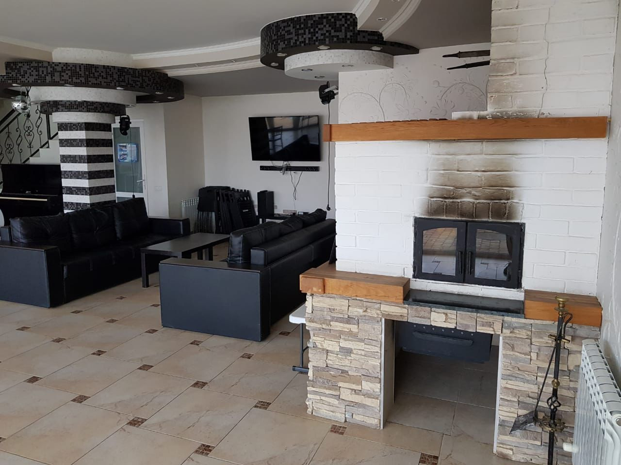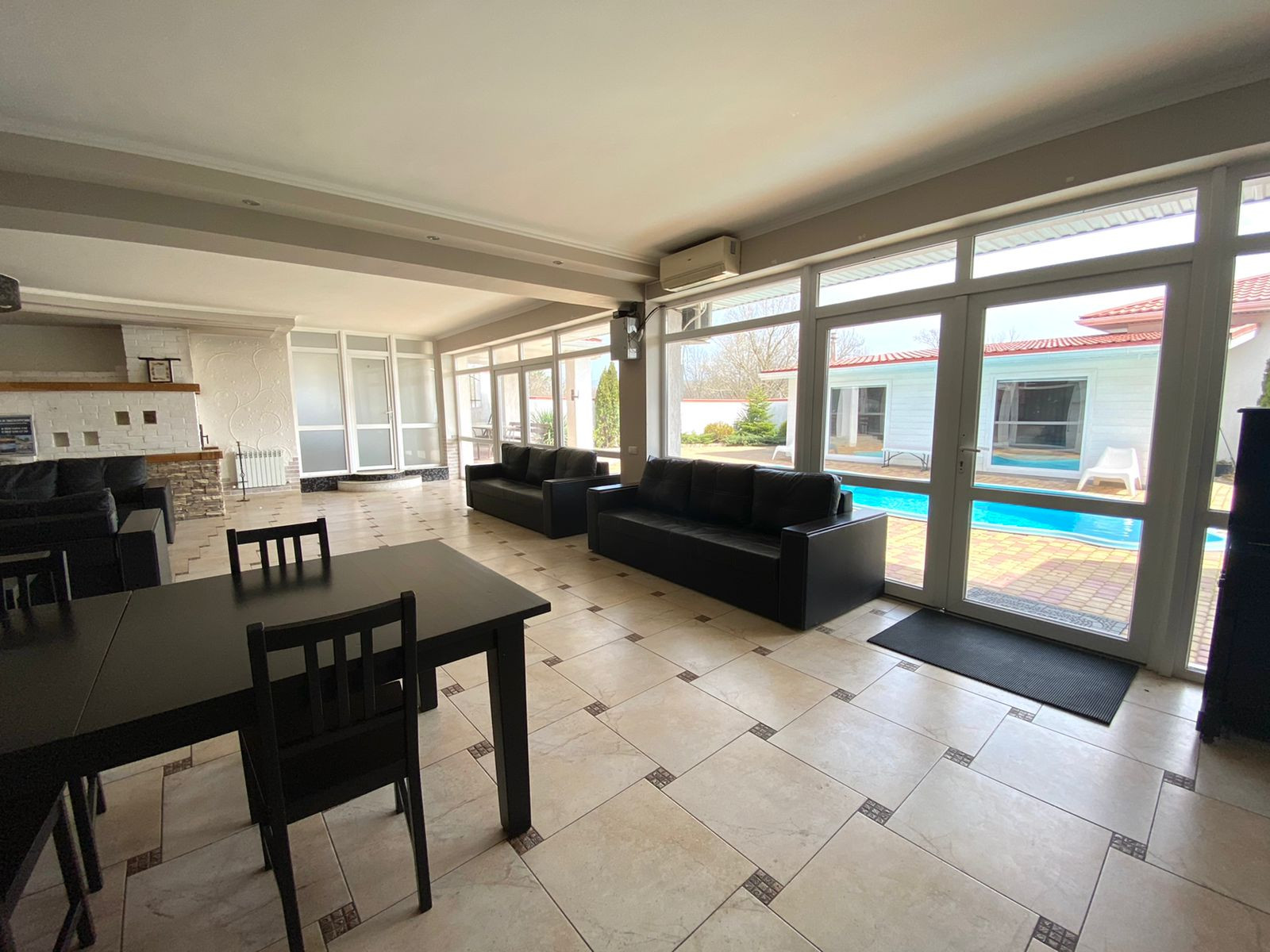 Огромная кухня гостиная с каминной зоной и выходом в бассейн