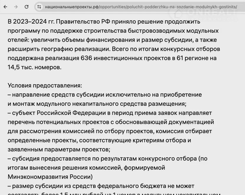Земля переводится в рекреацию, а значит можно получить грант на каждый модульный дом до 1.5 млн.