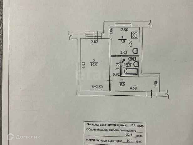 Общая площадь 32.4 кв.м., комната 14 кв.м. кухня 7 кв.м.