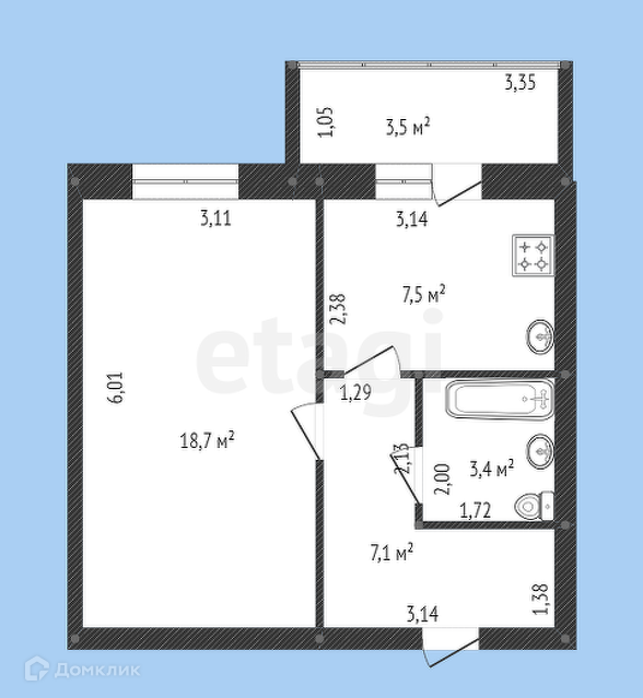 Общая площадь квартиры — 38,5 (36,1) кв.м., площадь кухни — 7,1 кв.м., санузла — 7,5 кв.м. Высота потолков 2,6 м.