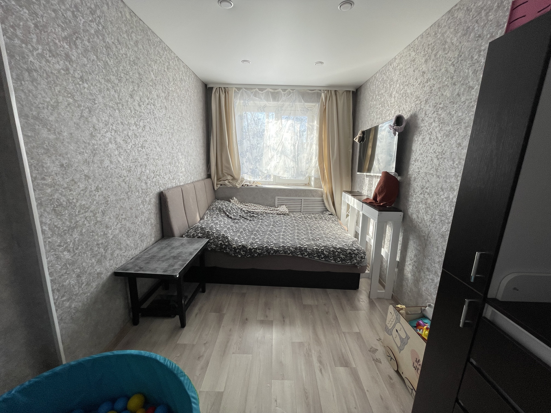 Пластиковые стеклопакеты установлены во всей квартире, балкон застеклен.