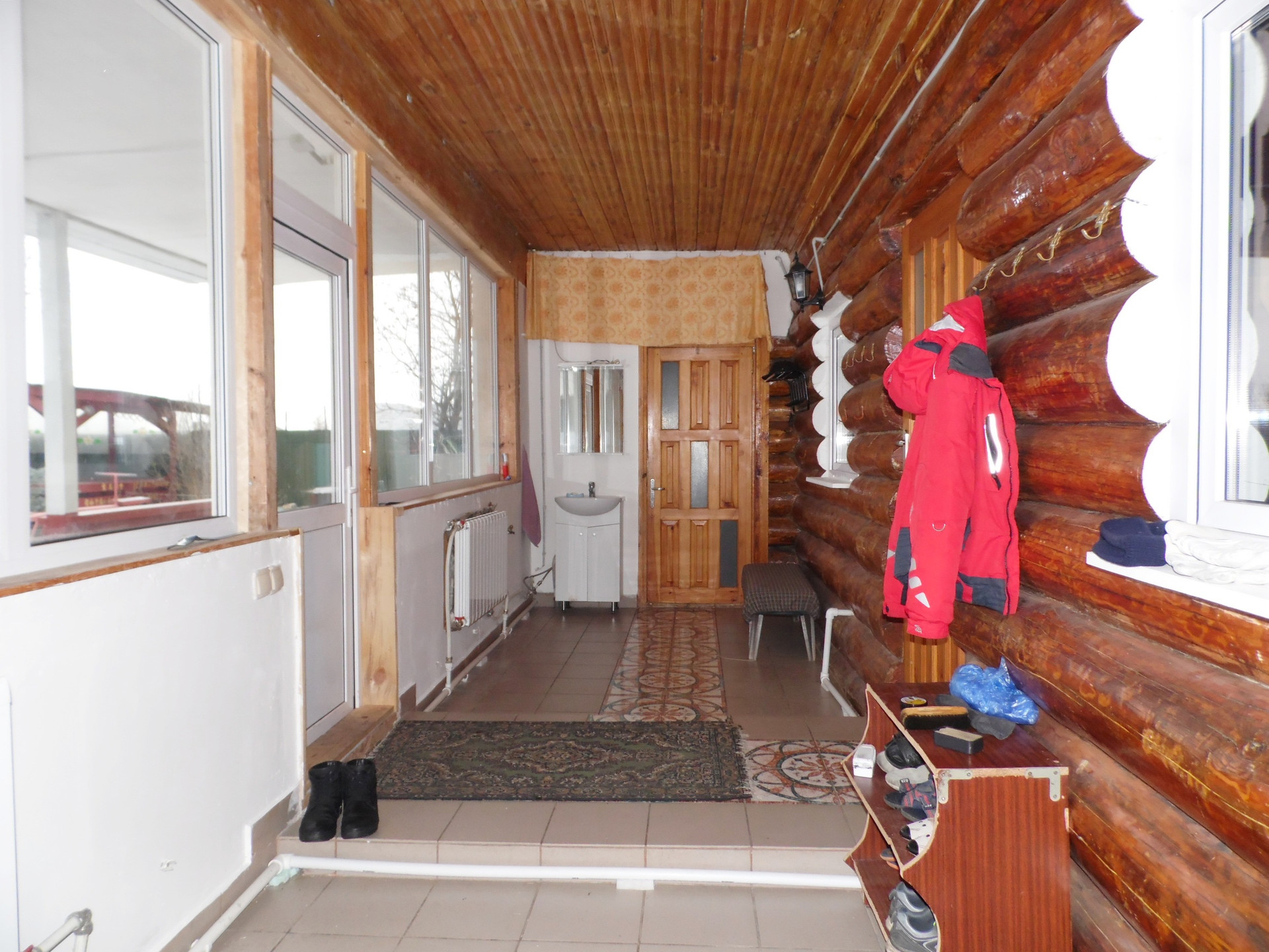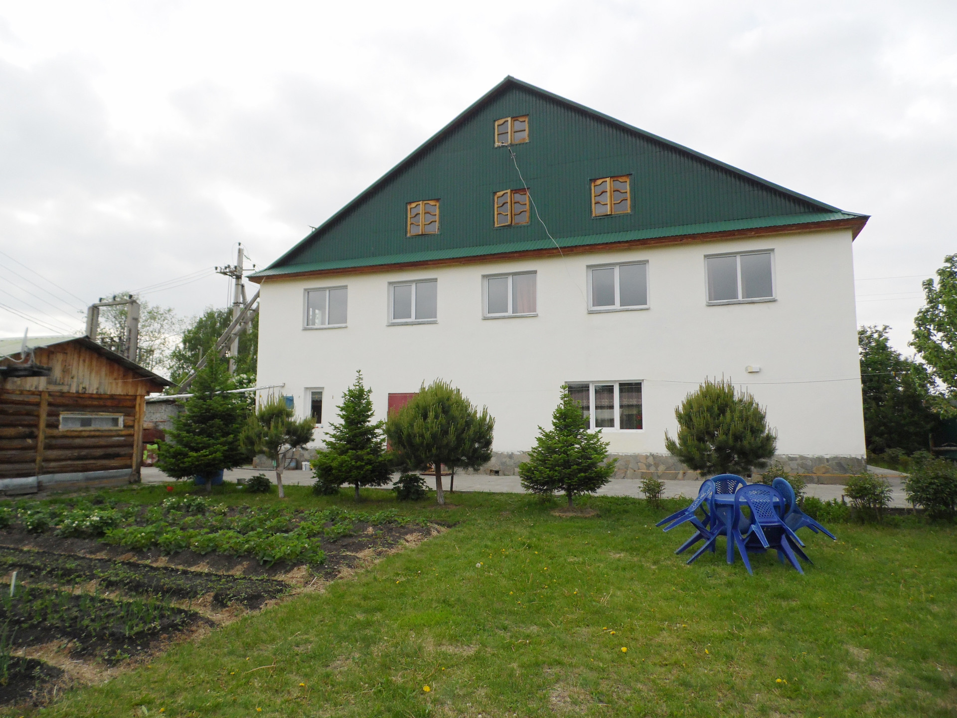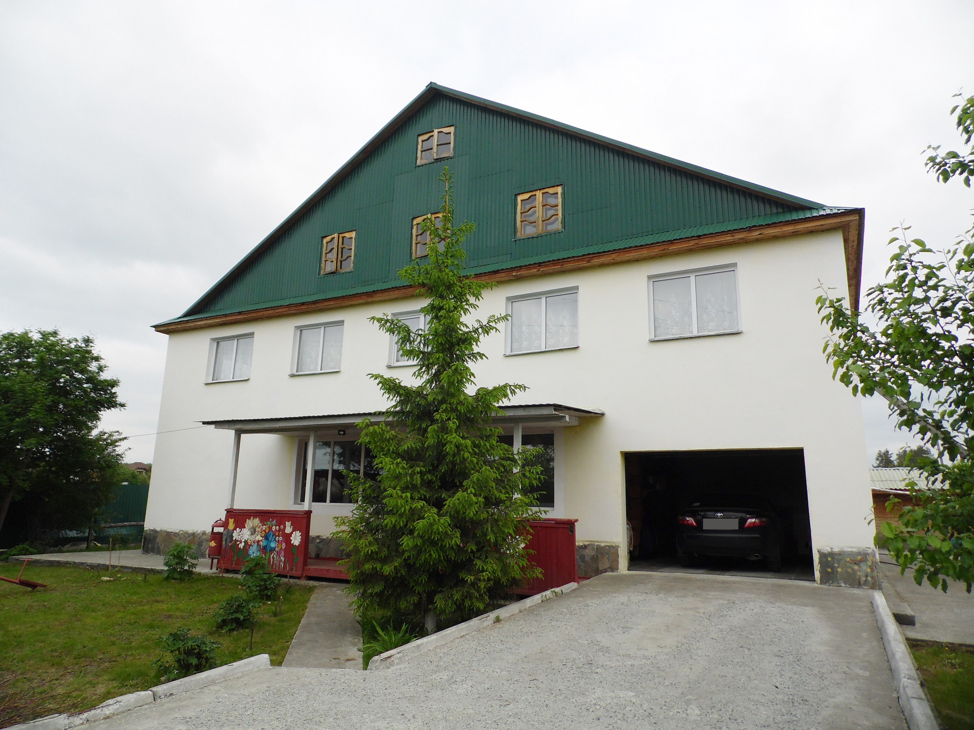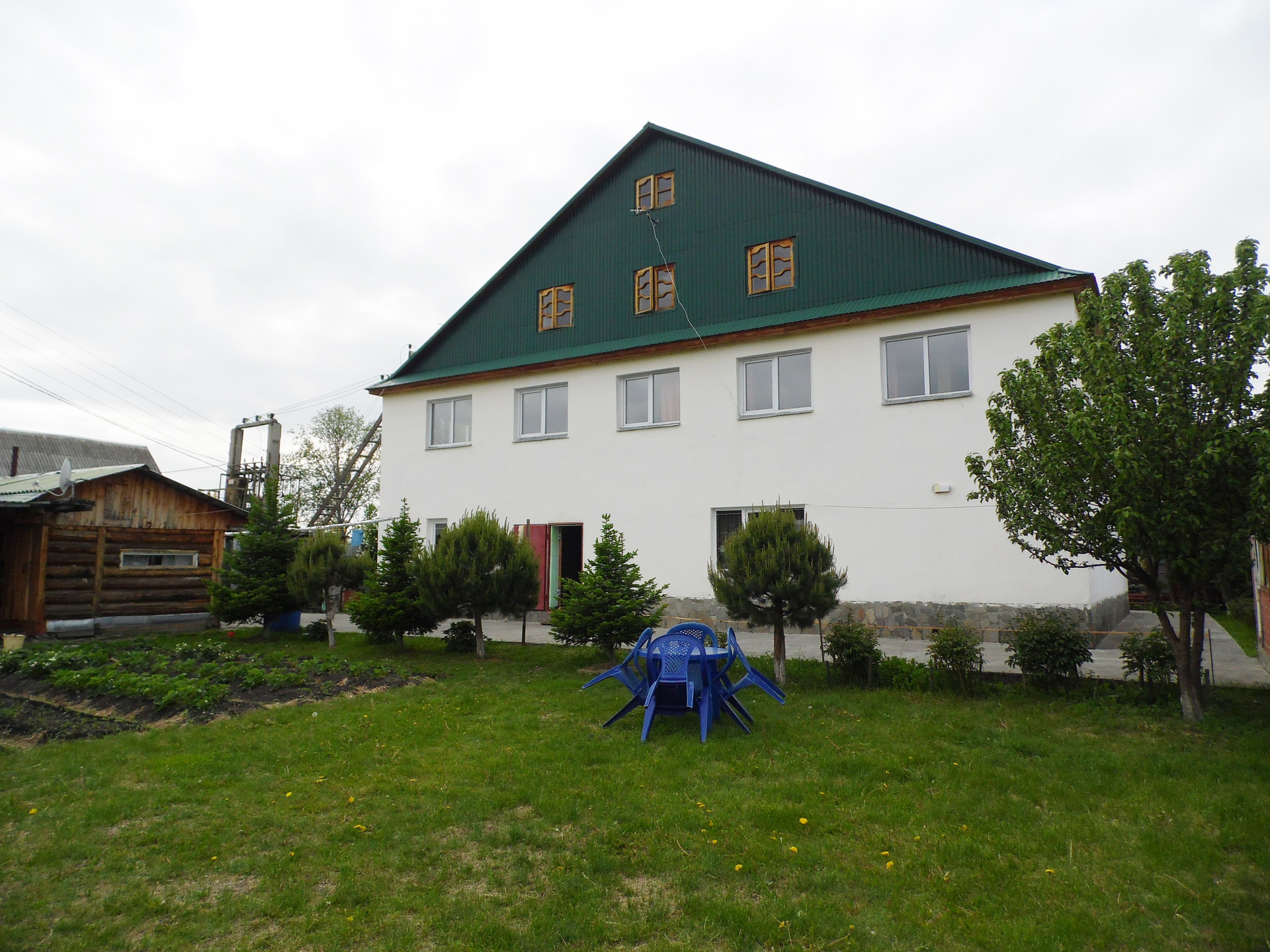 Основной дом построен: первый этаж – из кругляка, второй этаж и мансарды – каркасные с утеплением, плюс пристрой из пеноблока +утеплитель+штукатурка. Фундамент – бетонный ленточный. Перекрытия – деревянные. Кровля – металлический проф.лист.