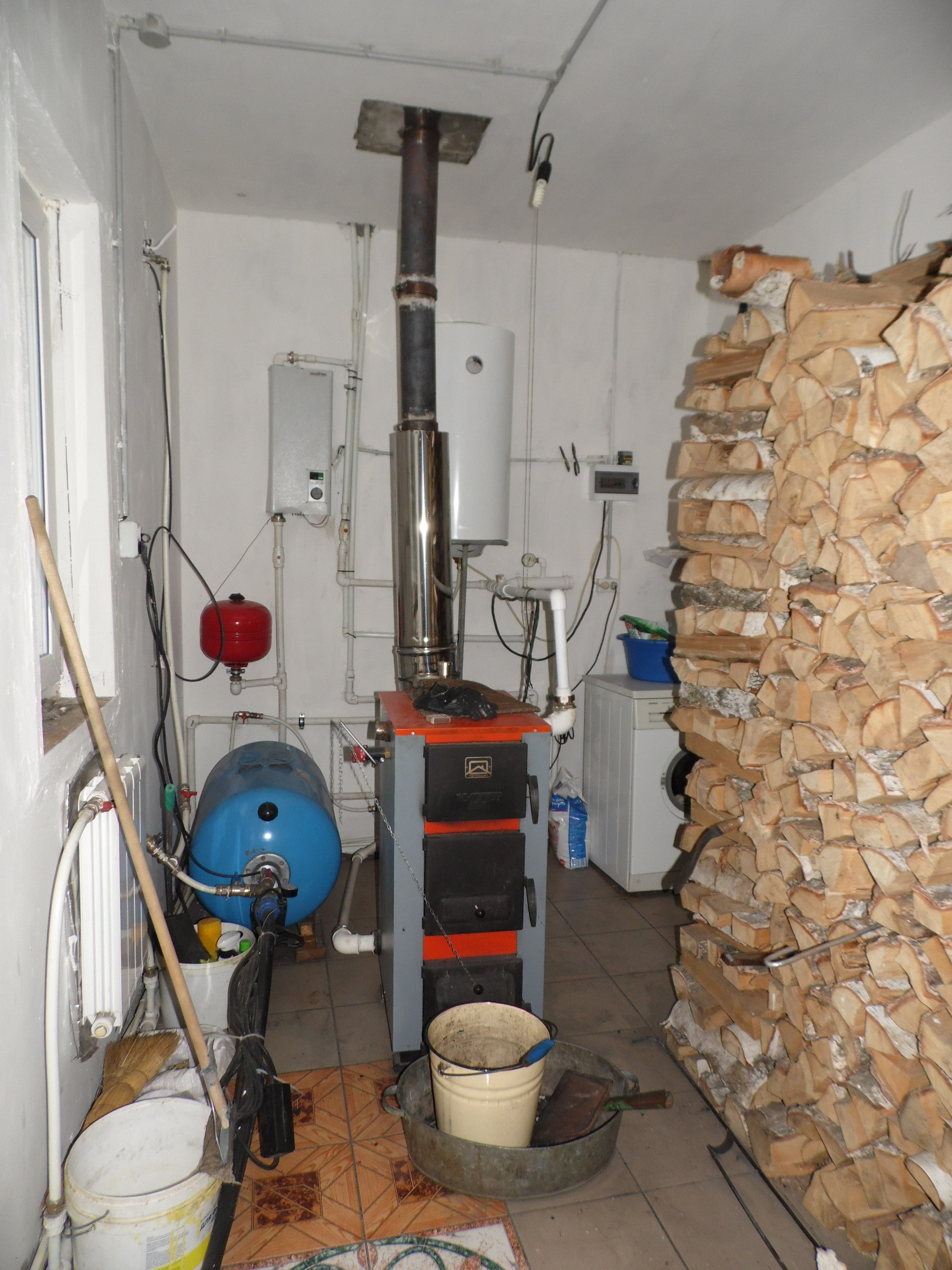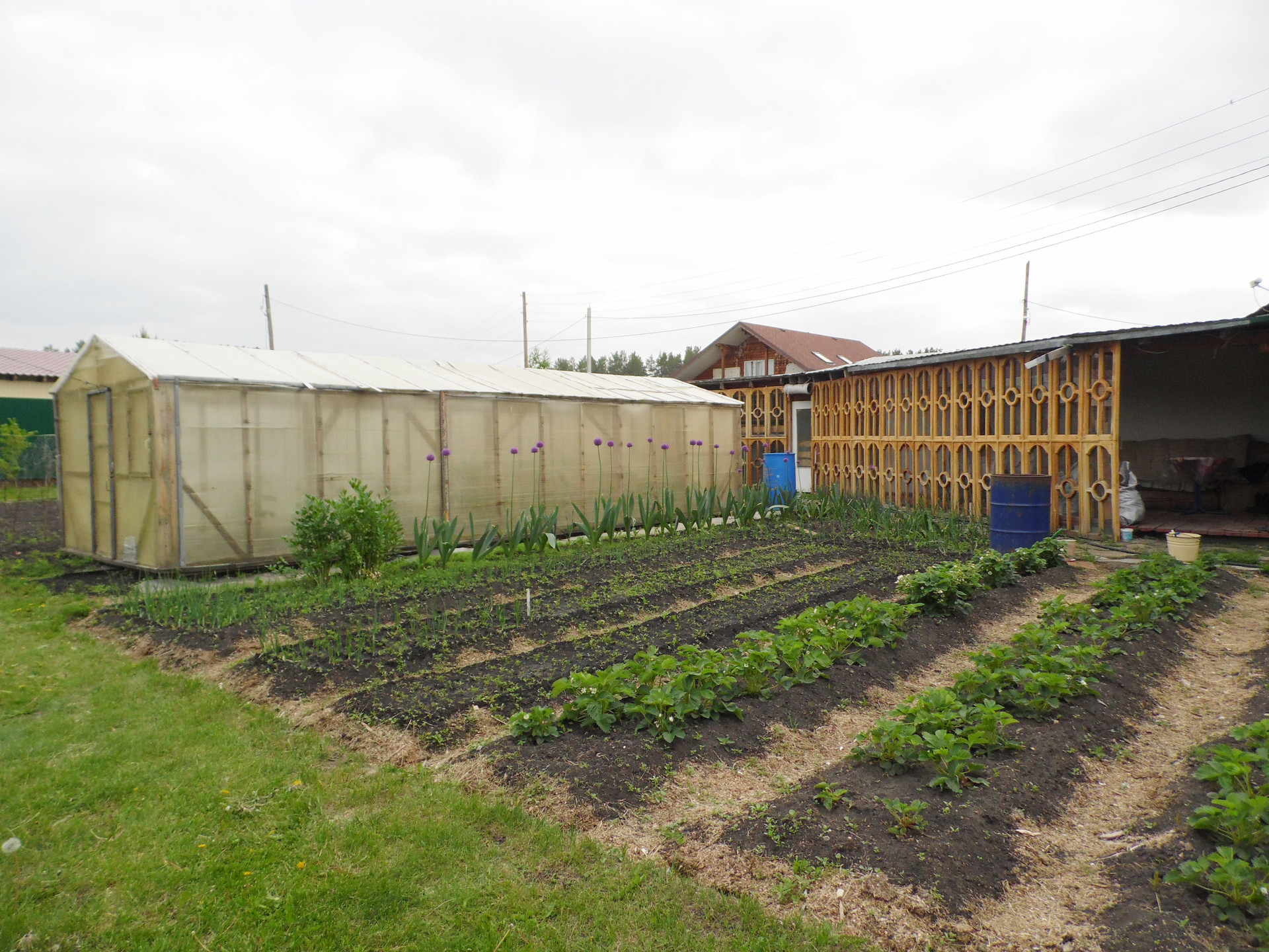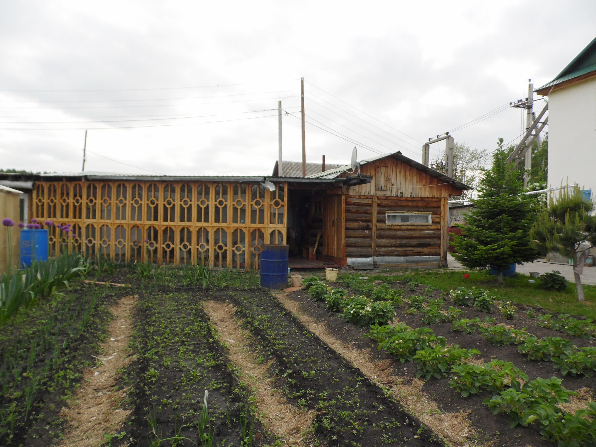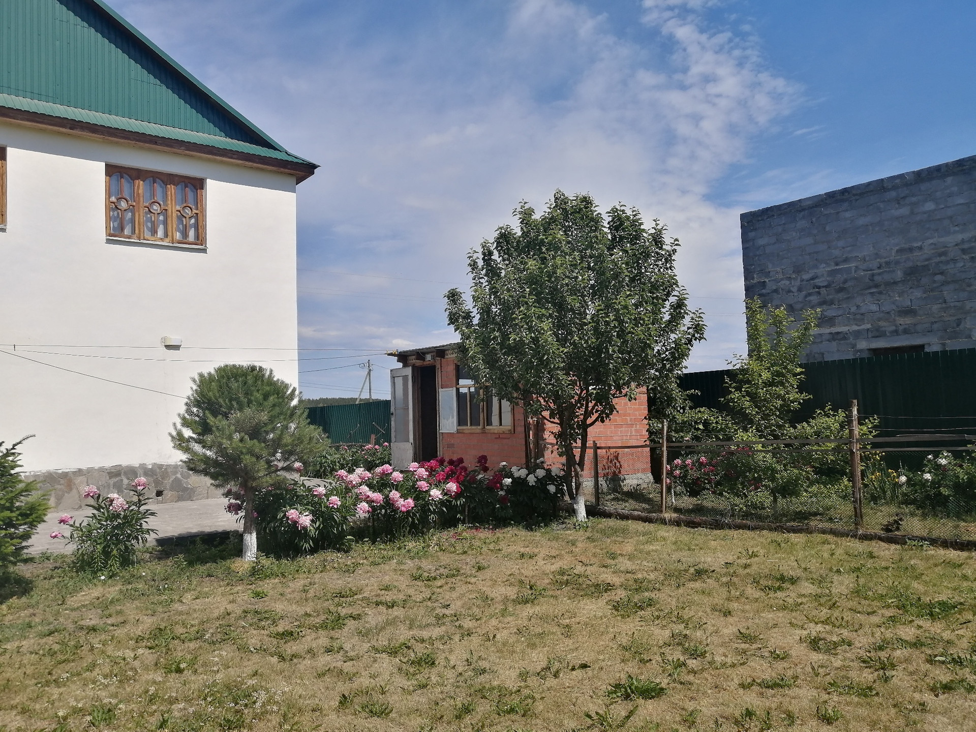 Основной дом построен: первый этаж – из кругляка, второй этаж и мансарды – каркасные с утеплением, плюс пристрой из пеноблока +утеплитель+штукатурка. Фундамент – бетонный ленточный. Перекрытия – деревянные. Кровля – металлический проф.лист.