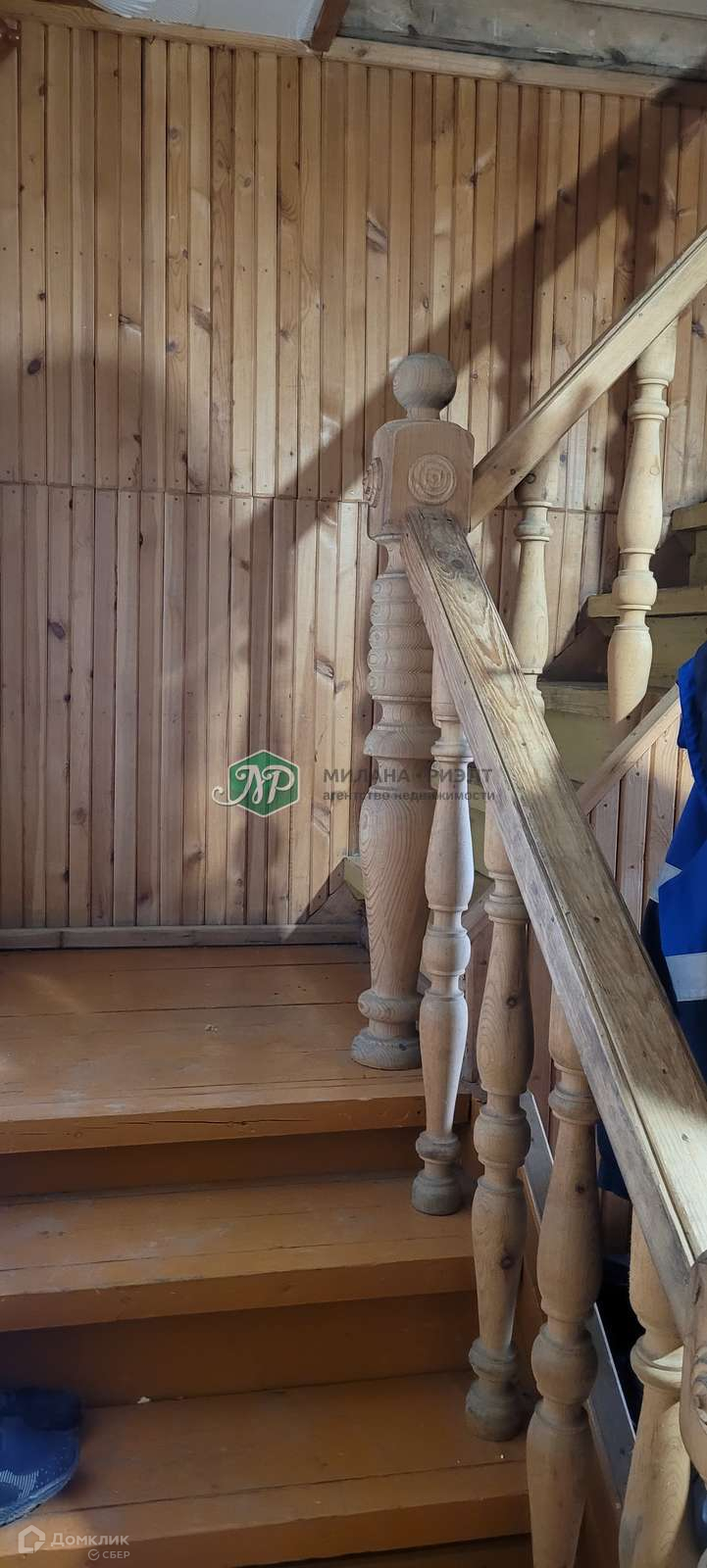 Добротная деревянная лестница. На втором этаже большая комната S= 25.4 кв.м.