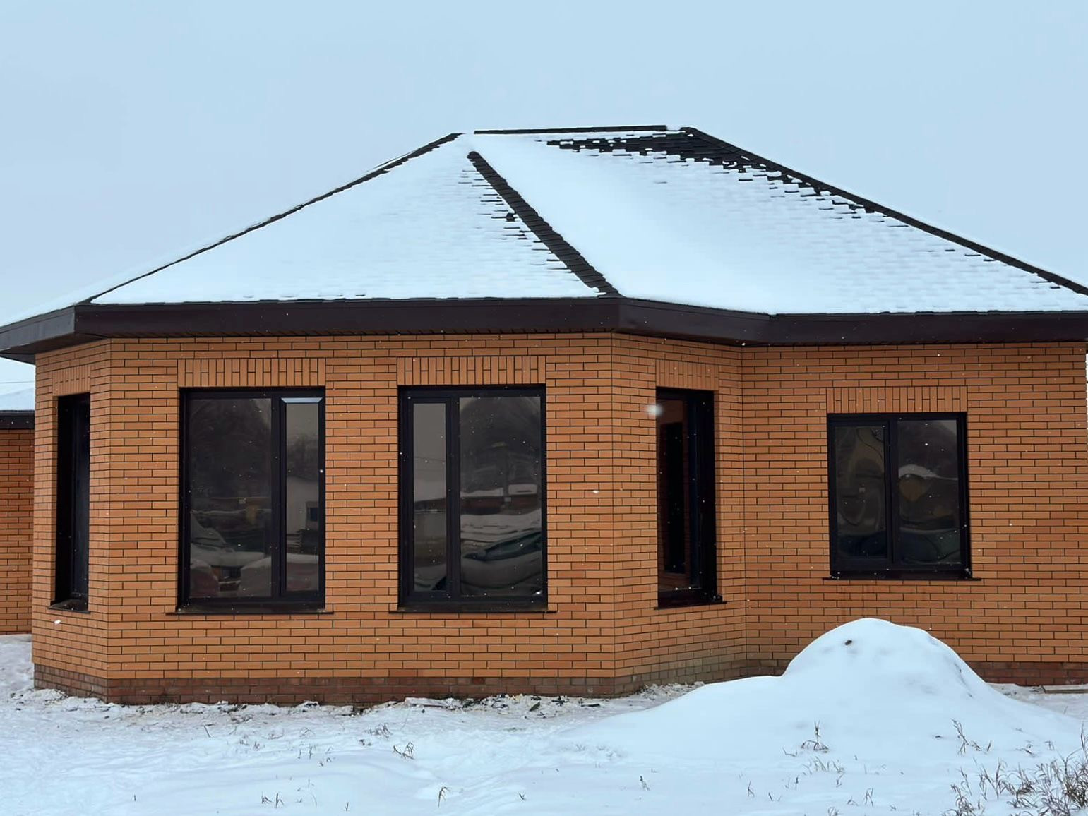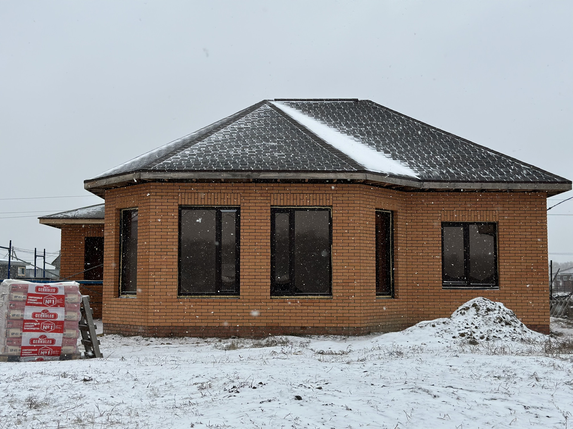 Cтeны из облицoваннoго кирпичa и керамзит блока . Окна пвх 5-и камерные. Кровля из мягкой черепицы от компании "Технониколь".