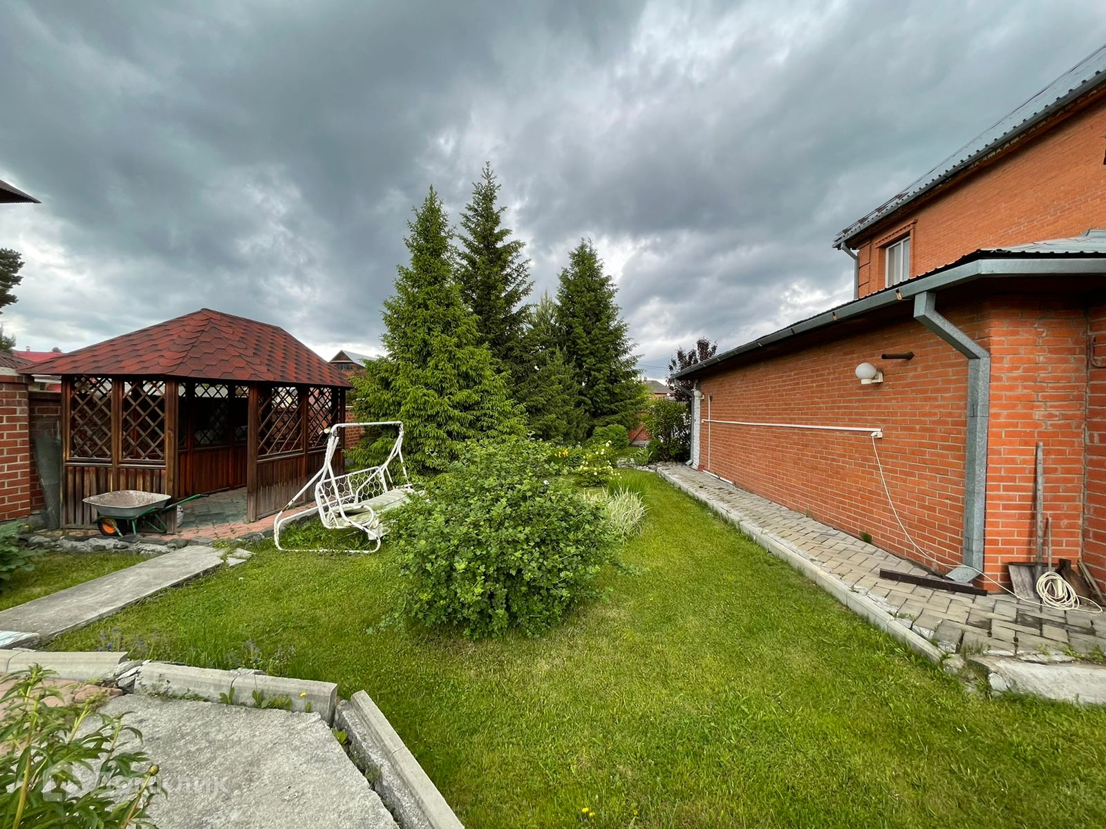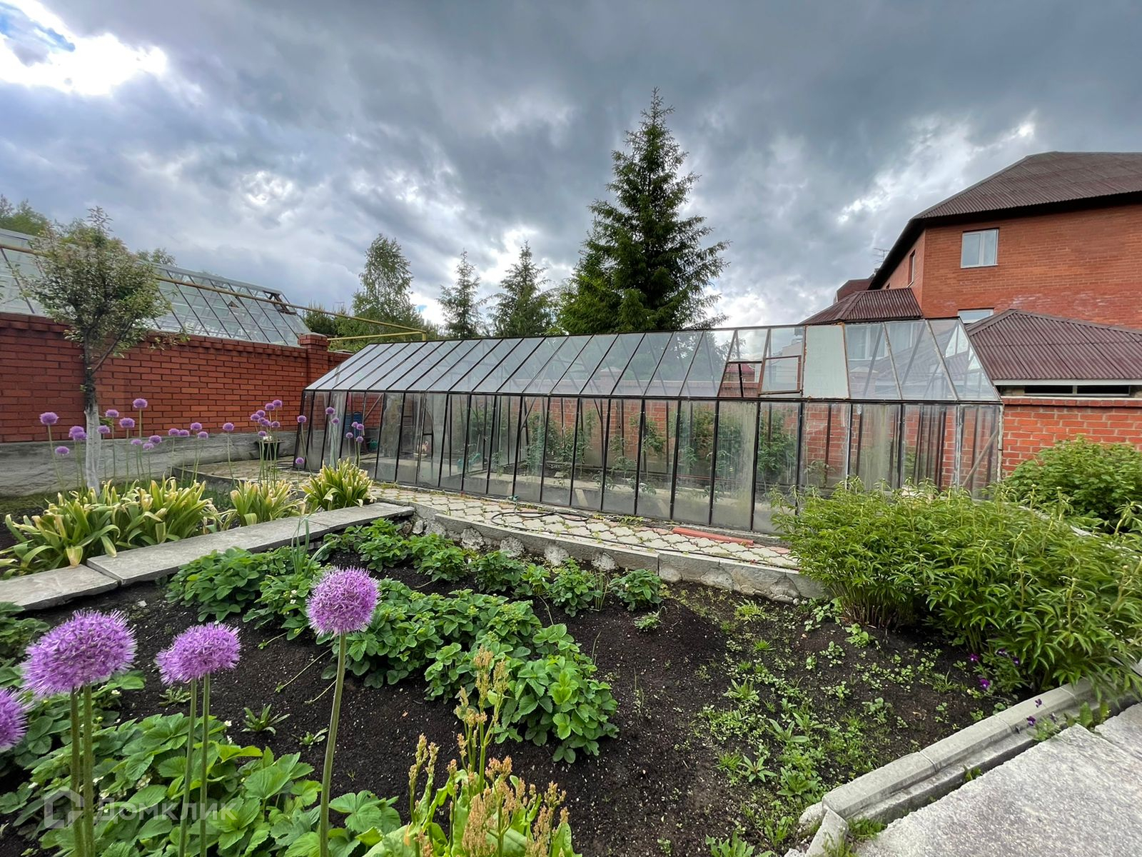 На участке выполнен ландшафтный дизайн, есть большая, застекленная теплица, летняя беседка с зоной барбекю.