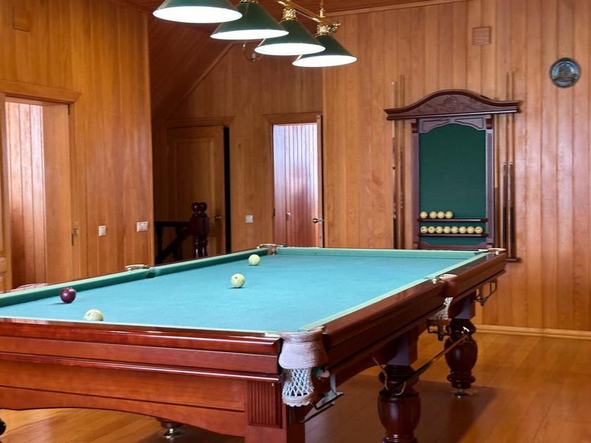 На мансарде - бильярдная, обитая дорогостоящими деревянными рейками без единой засечки, и 3 комнаты.