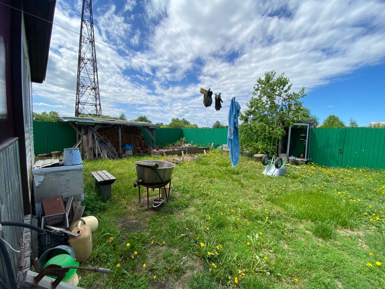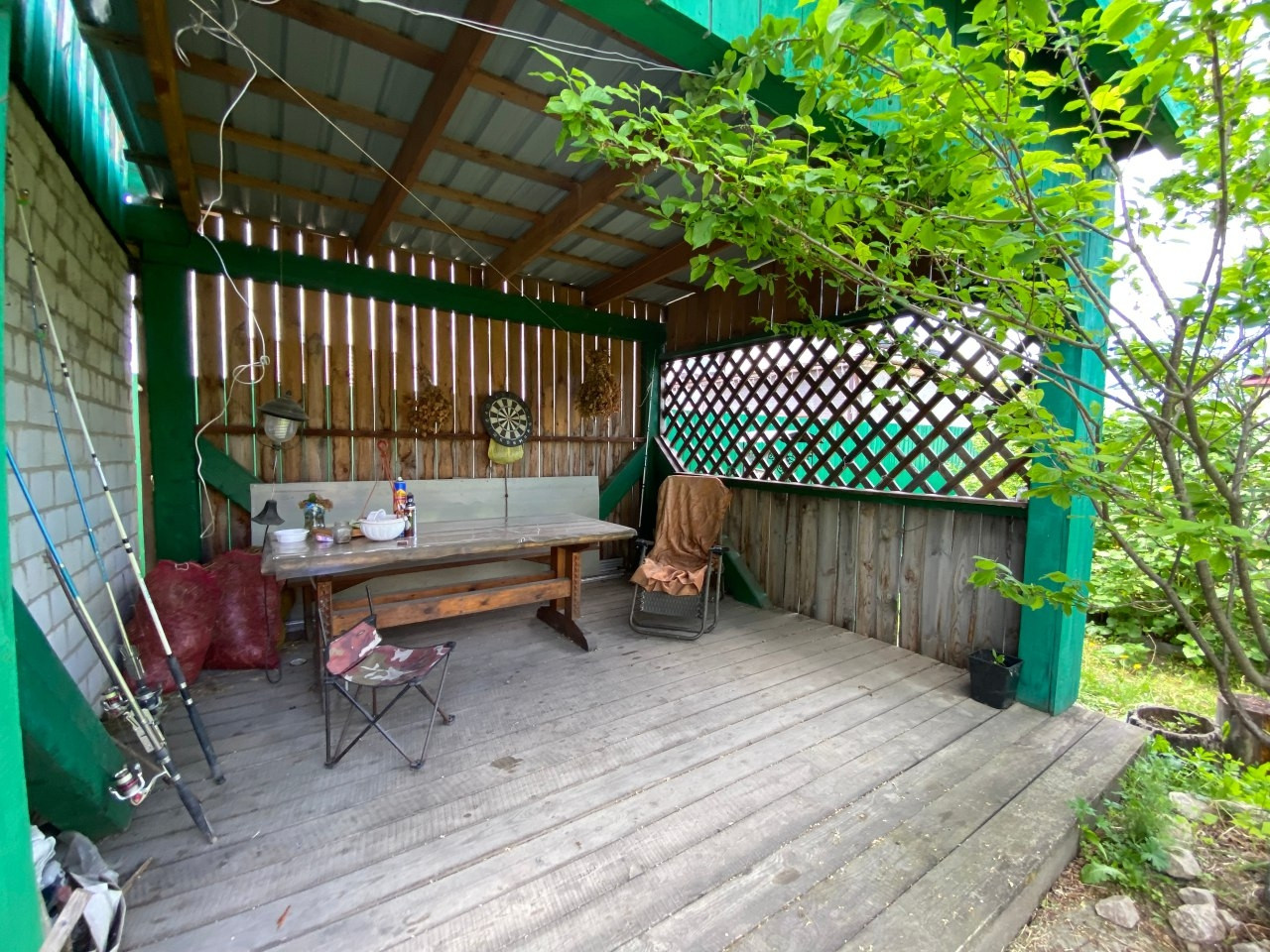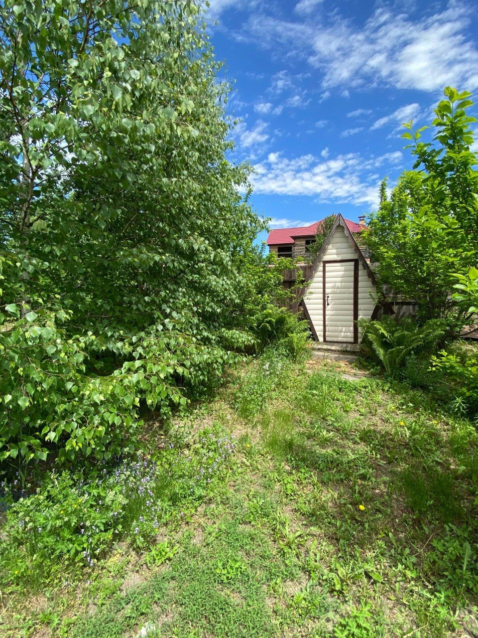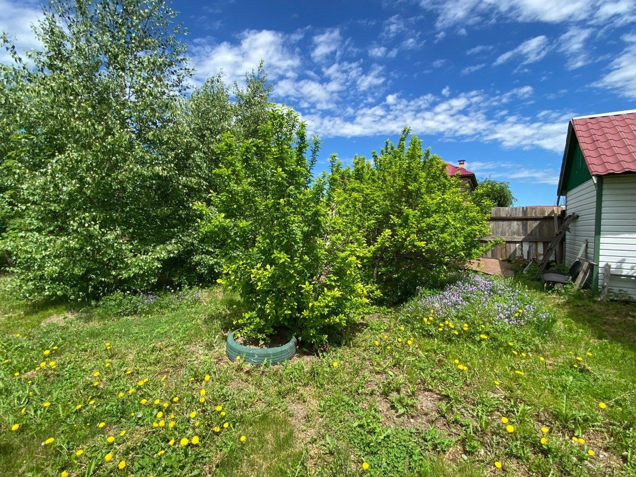 20 соток, ухоженный, с плодовыми деревьями и цветниками. Электричество, вода (скважина), отопление печное, интернет.