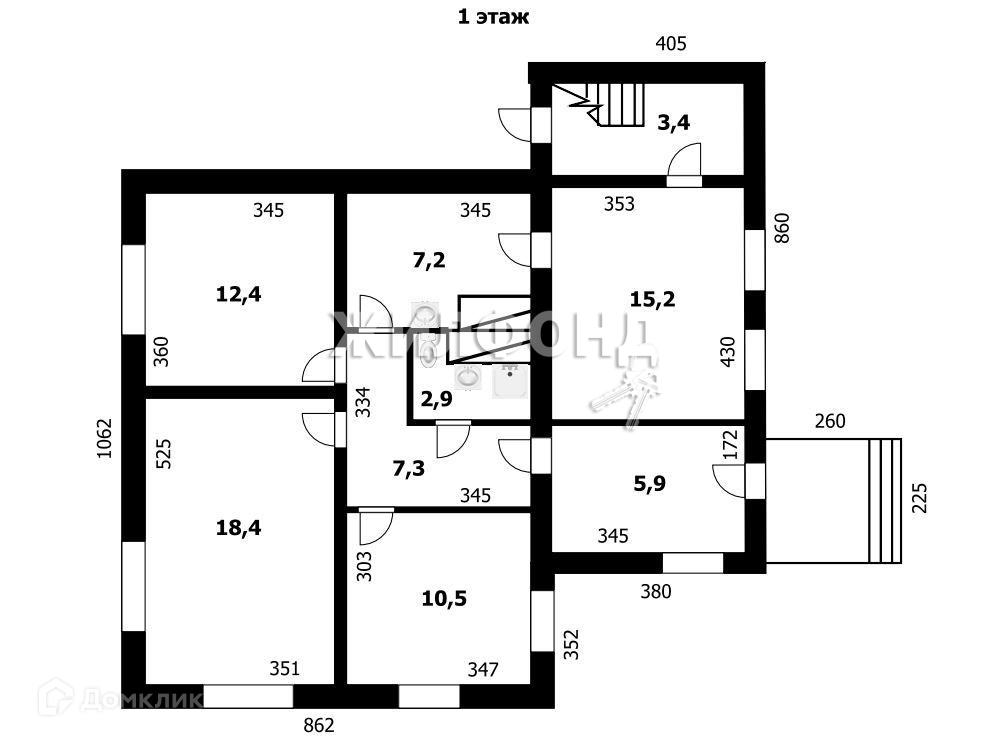 В доме на первом этаже расположены 3 комнаты, кухня-гостиная 22,4 м2, санузел, прихожая. На втором этаже гостиная, бильярдная, санузел.