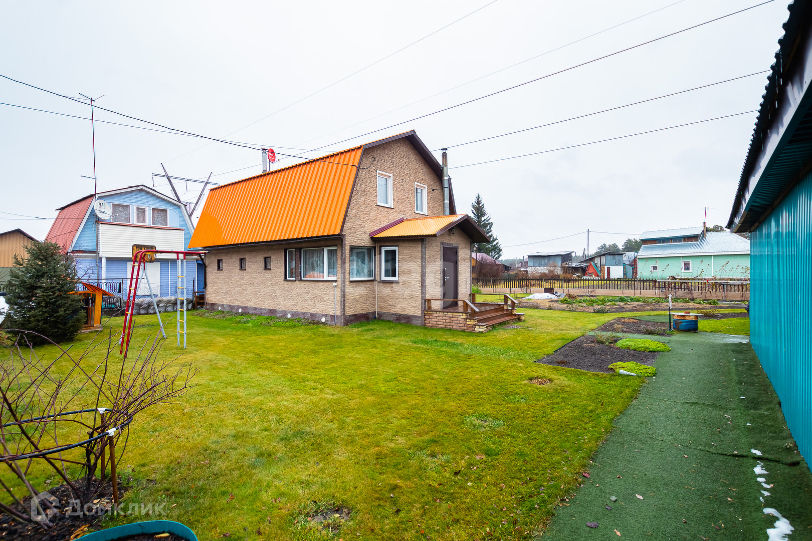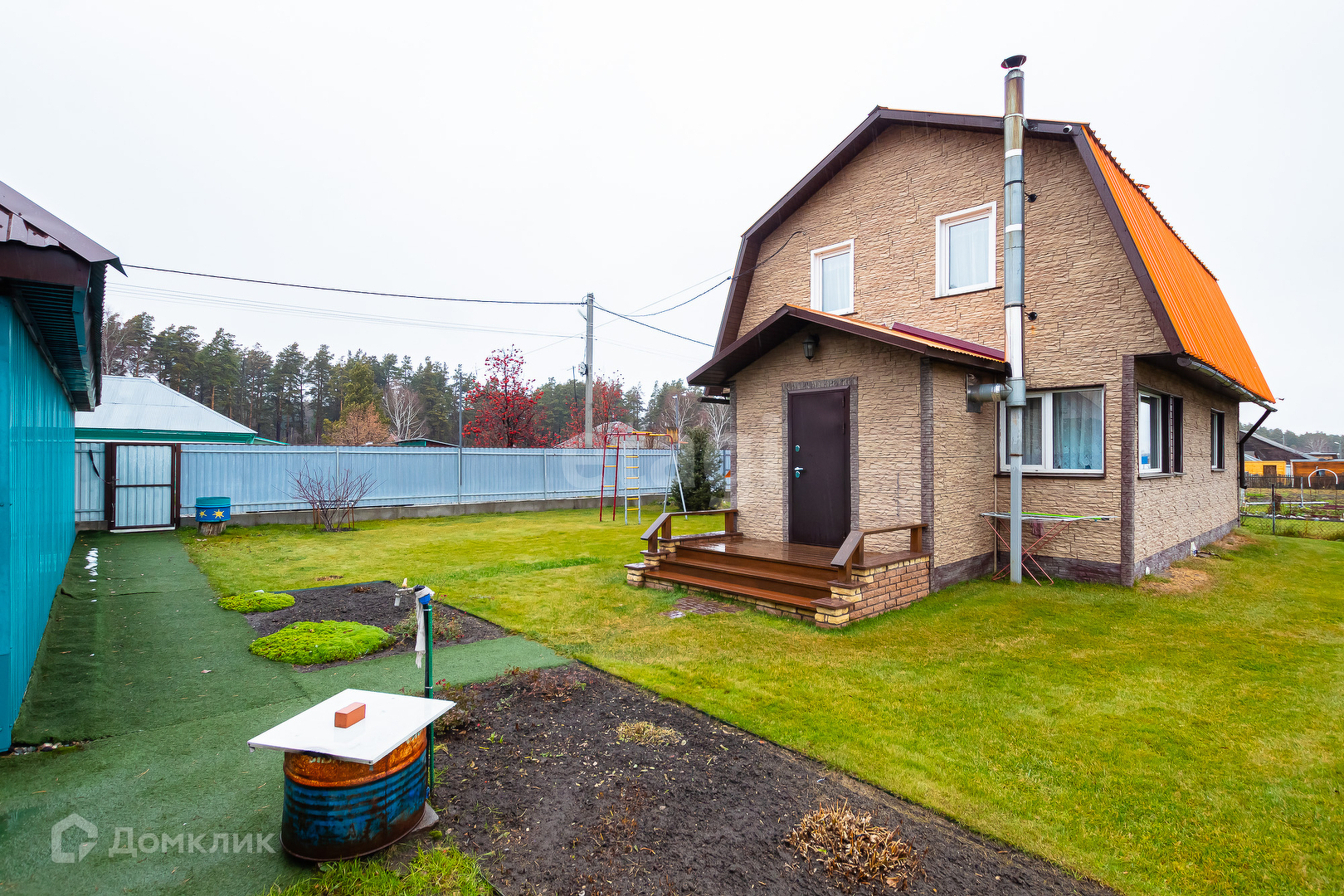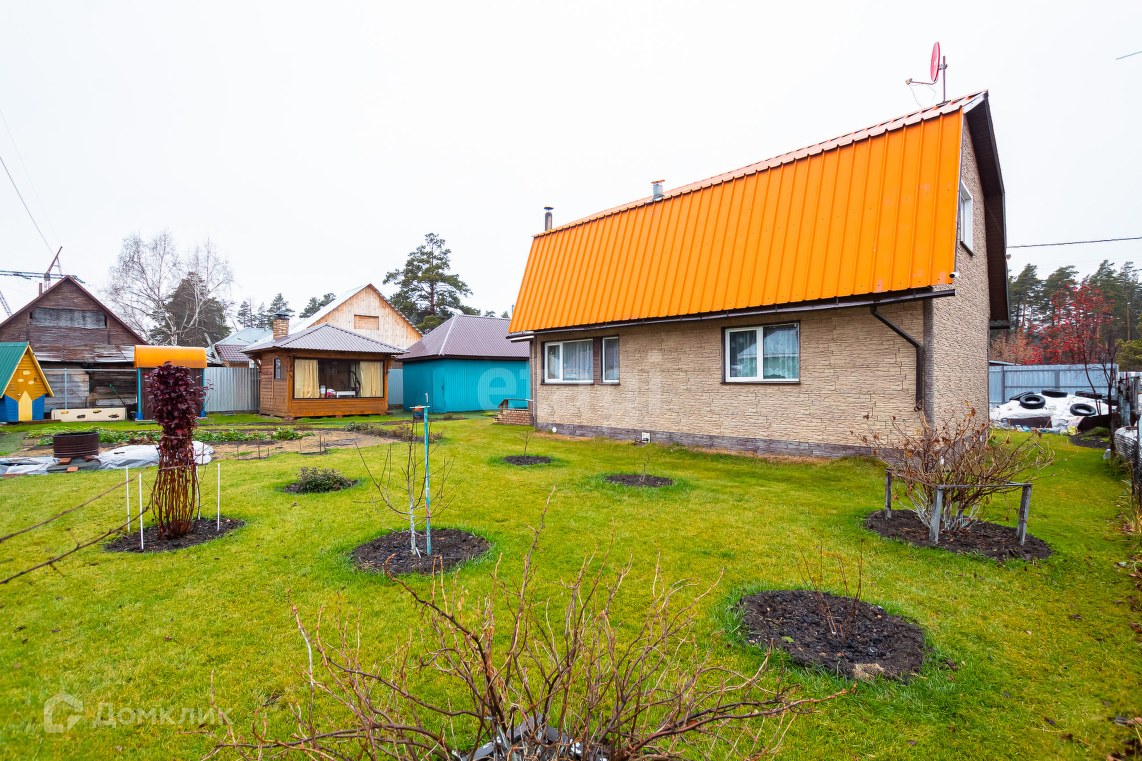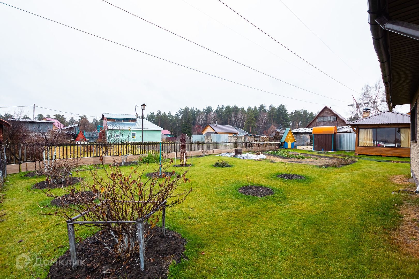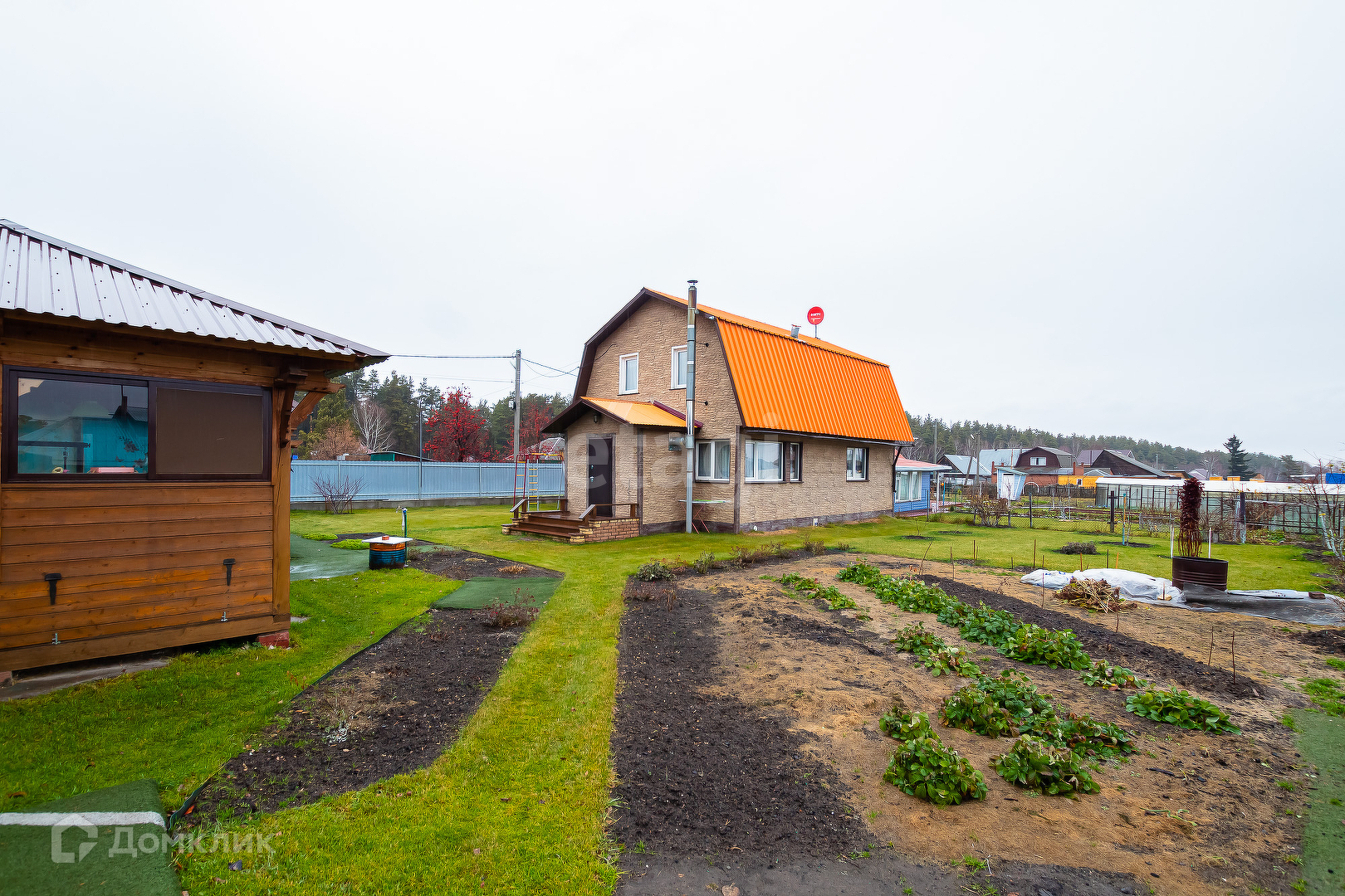Вокруг дома ровный чистый газон, зона сада с плодовыми насаждениями: малина, смородина, яблоня, полукультурка, крыжовник, шиповник, ирга и также имеется цветник.
