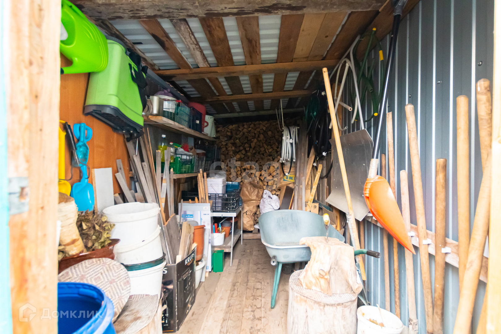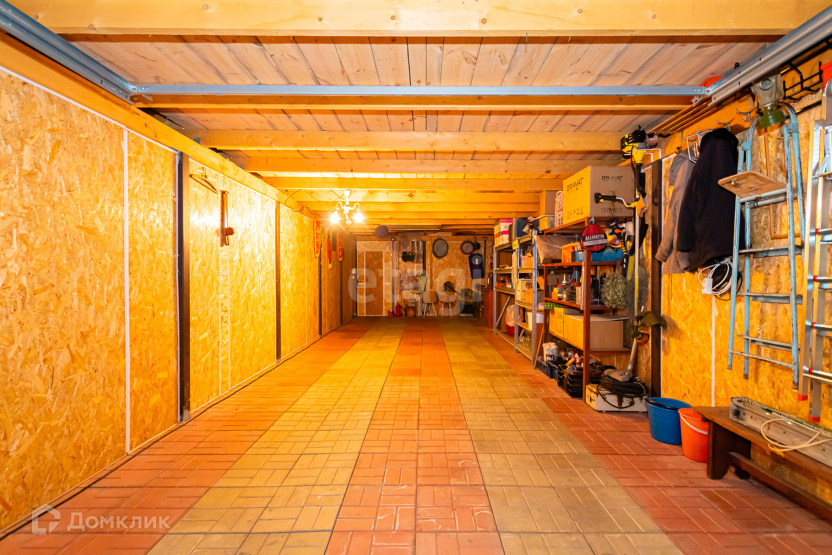 Добротный гараж-мастерская на 2 машины, лаз на чердак, установлена складная лестница. Гараж обшит изнутри ОСБ с утеплителем.