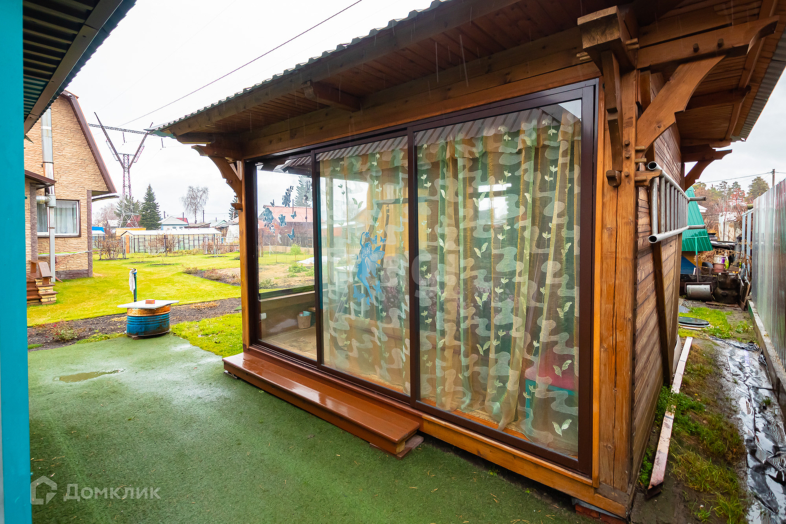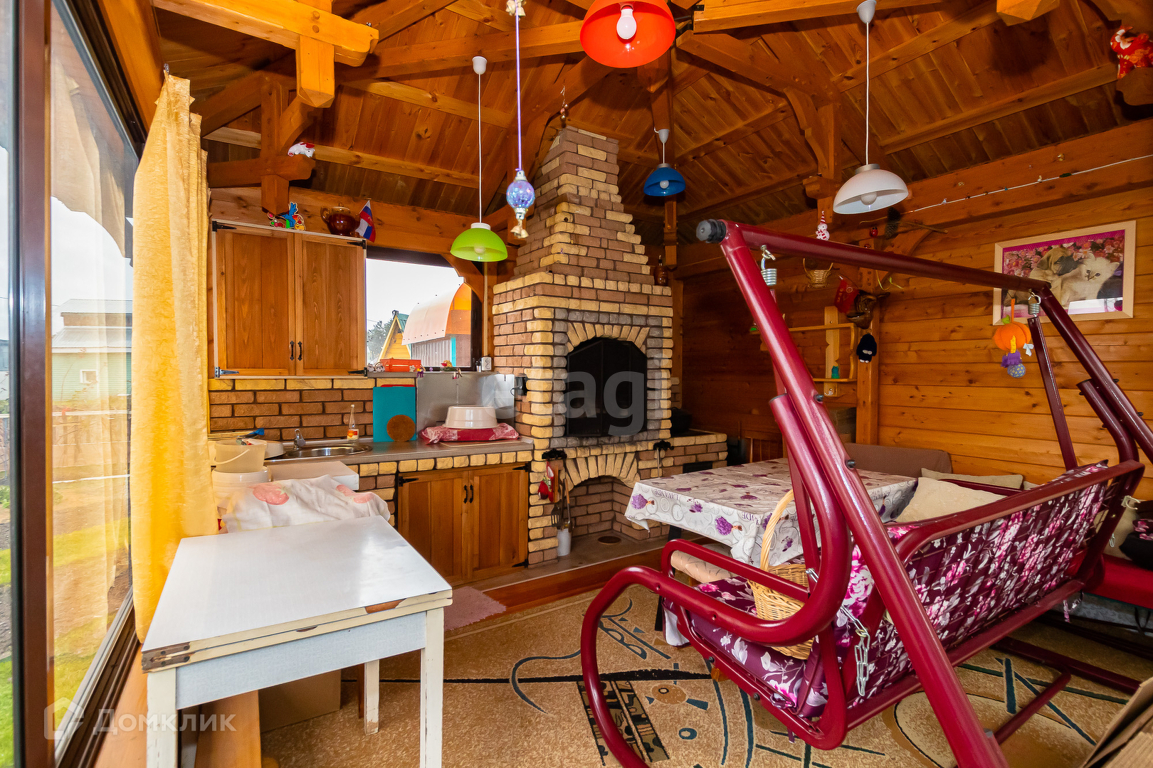 Рядом беседка. С одной стороны во всю ширину стены панорамные окна. Сторона со входом с раздвижными окнами в пол . Зона барбекю выполнена из огнеупорного рваного жёлтого/серого кирпича с вертелем на электроприводе. Отдельный септик.