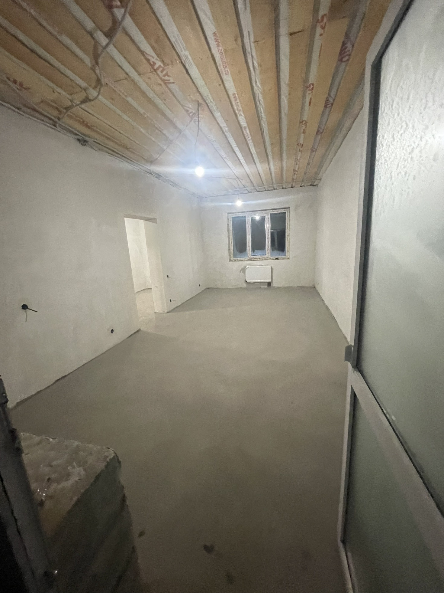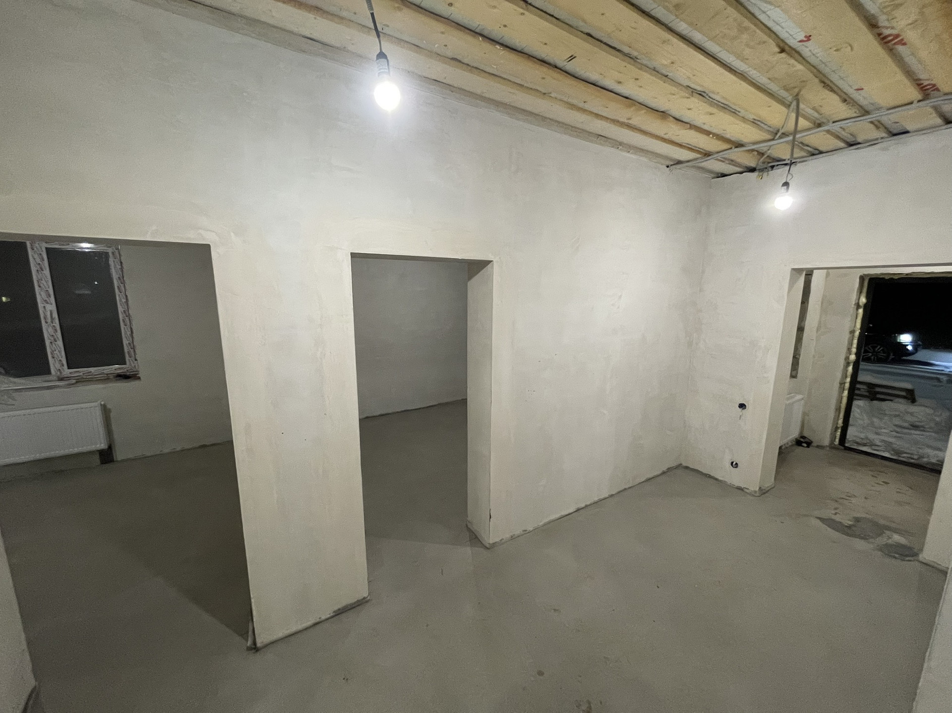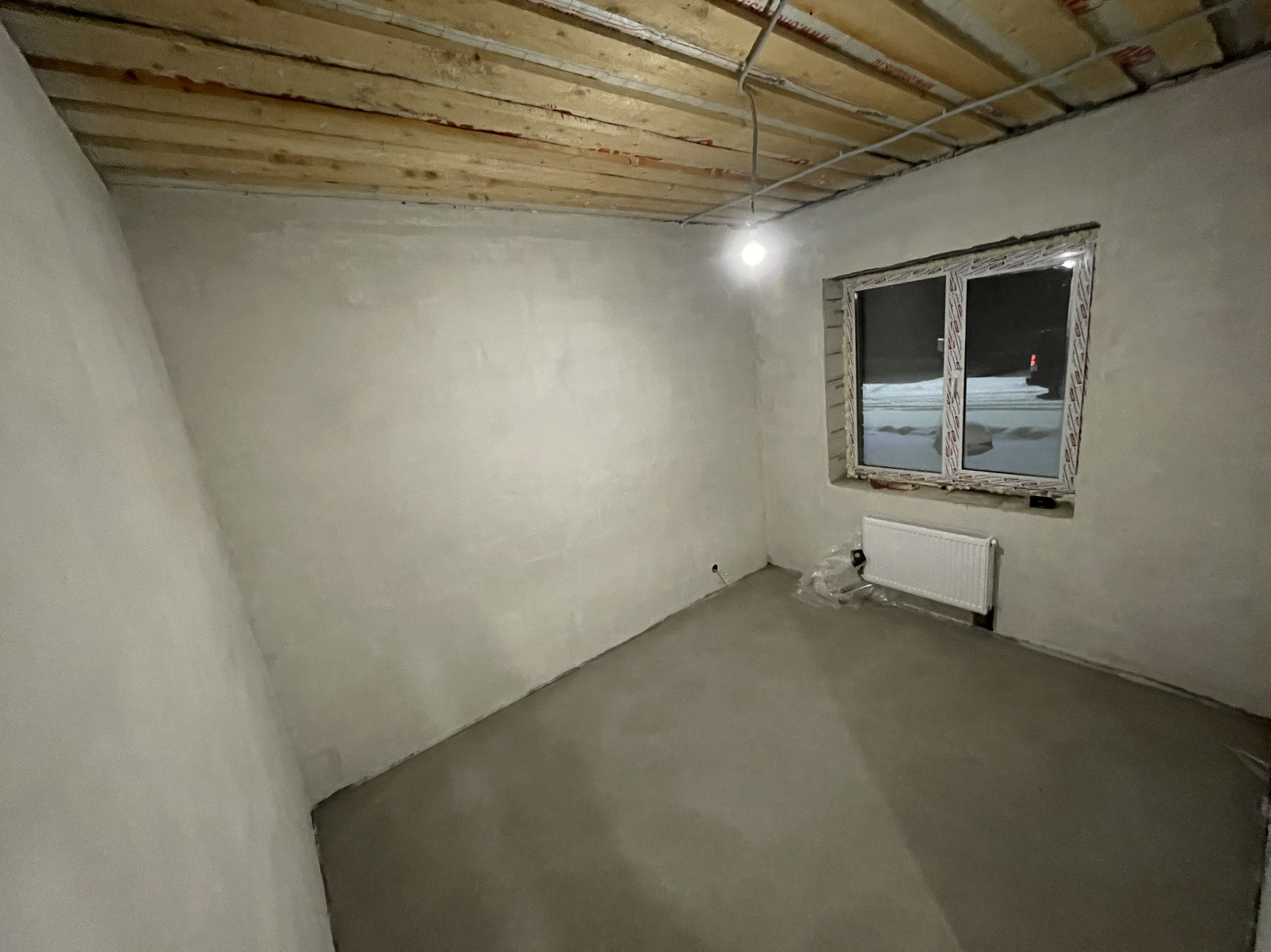 Предчистовая отделка . Стены заштукатурены под маяки, теплые полы, сухая стяжка пола.