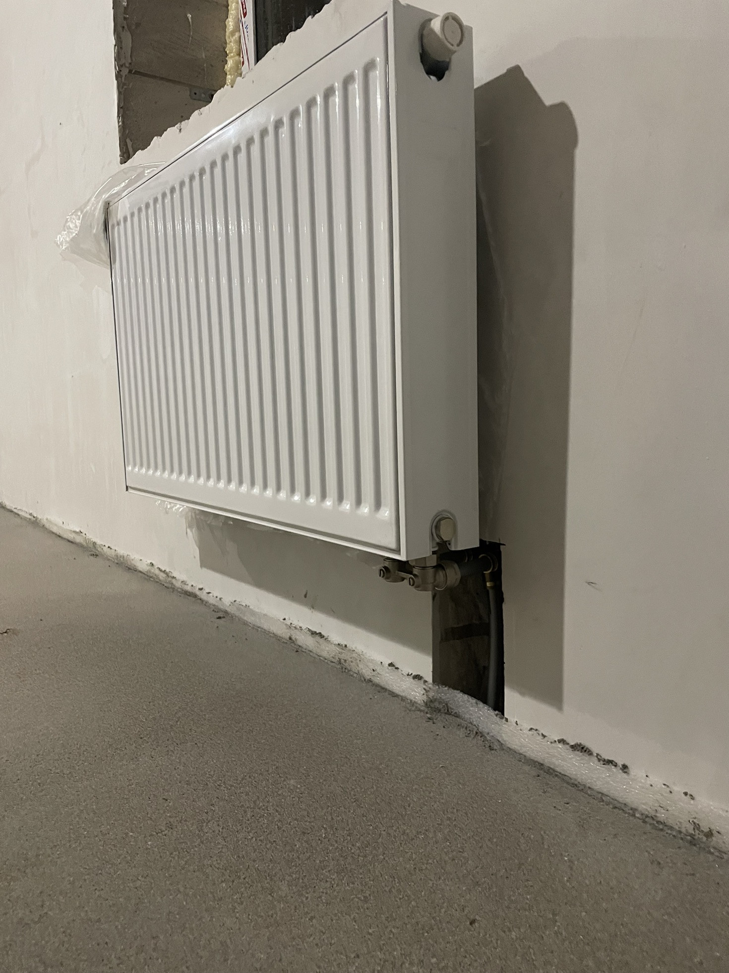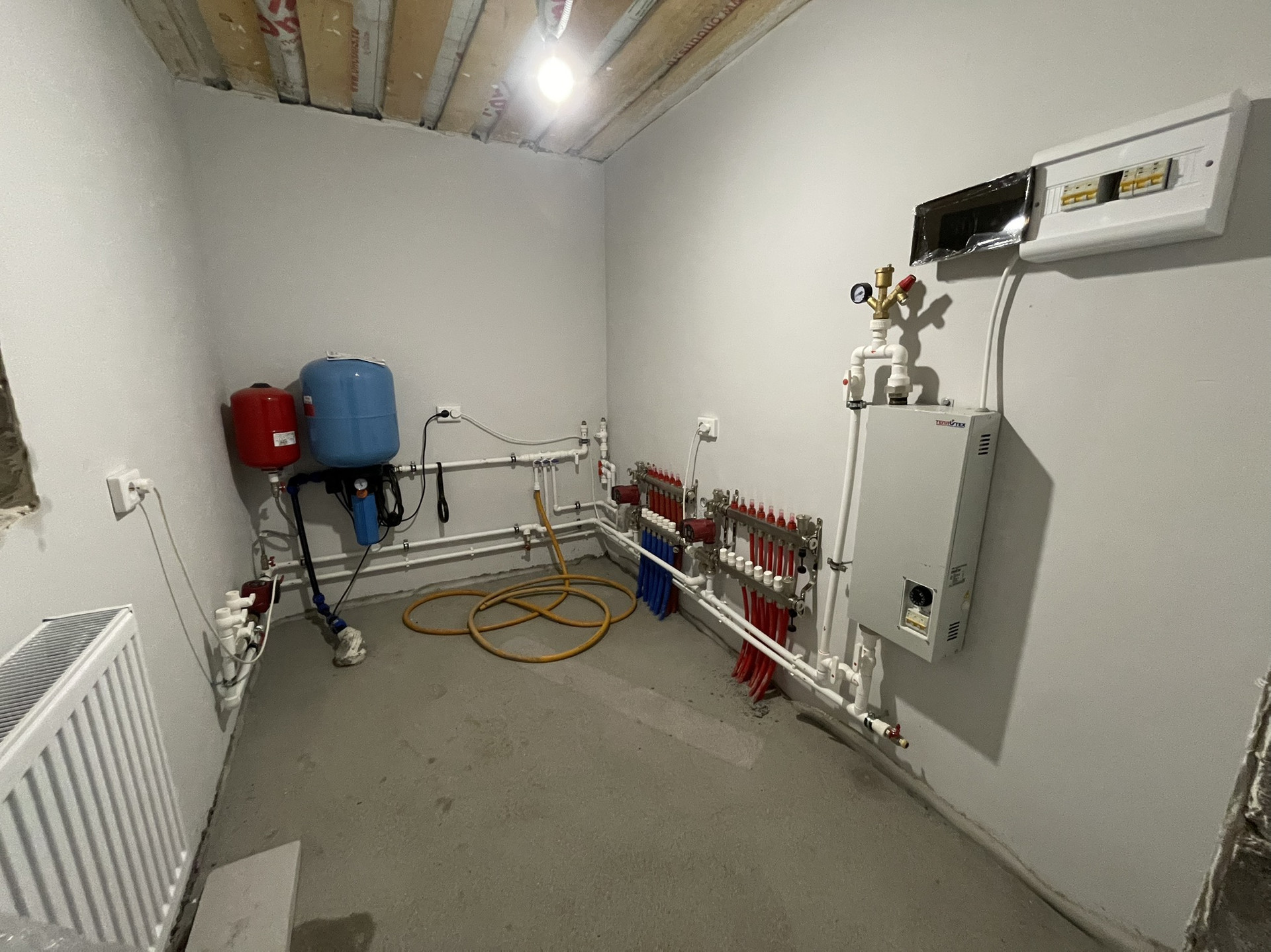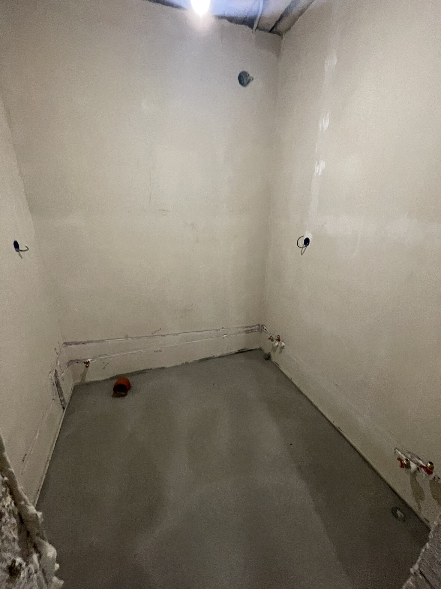 Предчистовая отделка . Стены заштукатурены под маяки, теплые полы, сухая стяжка пола.