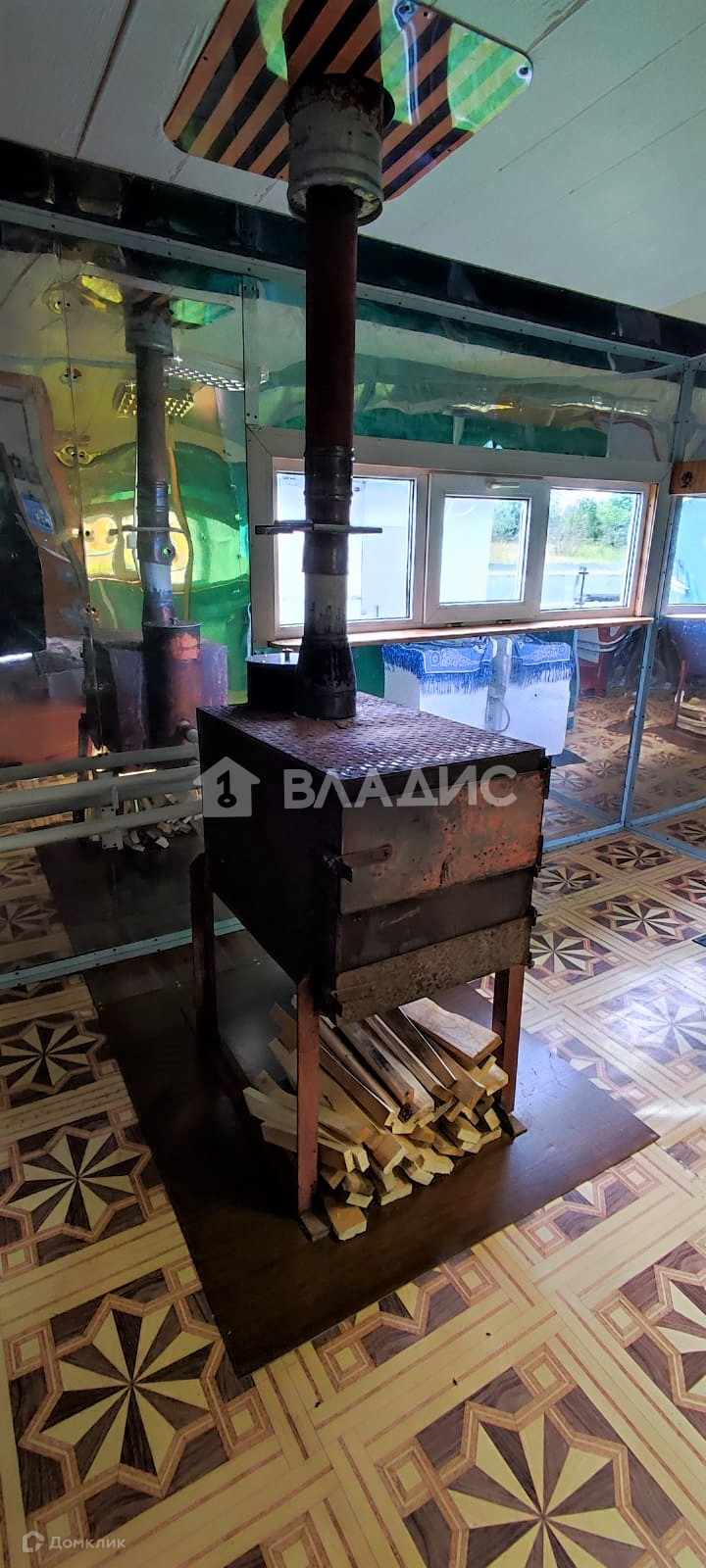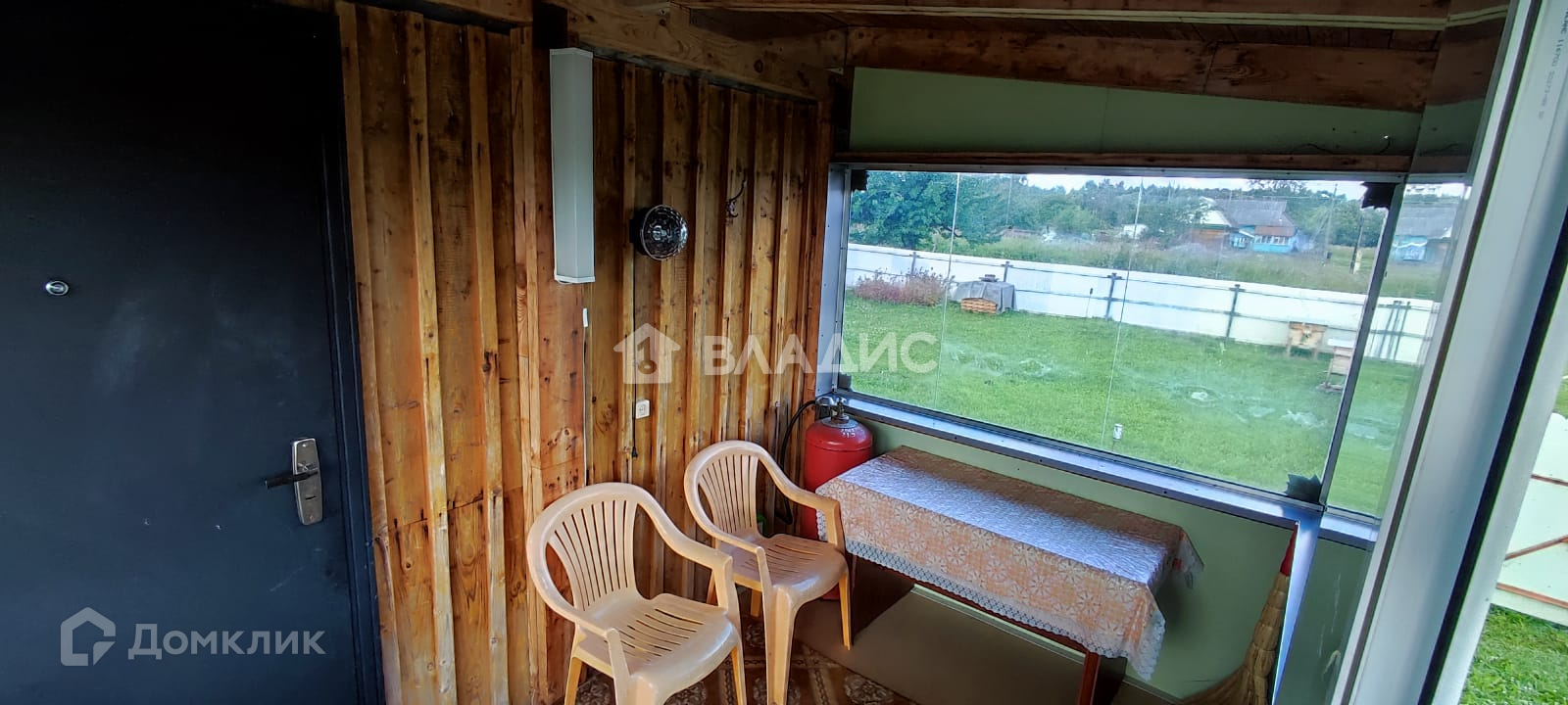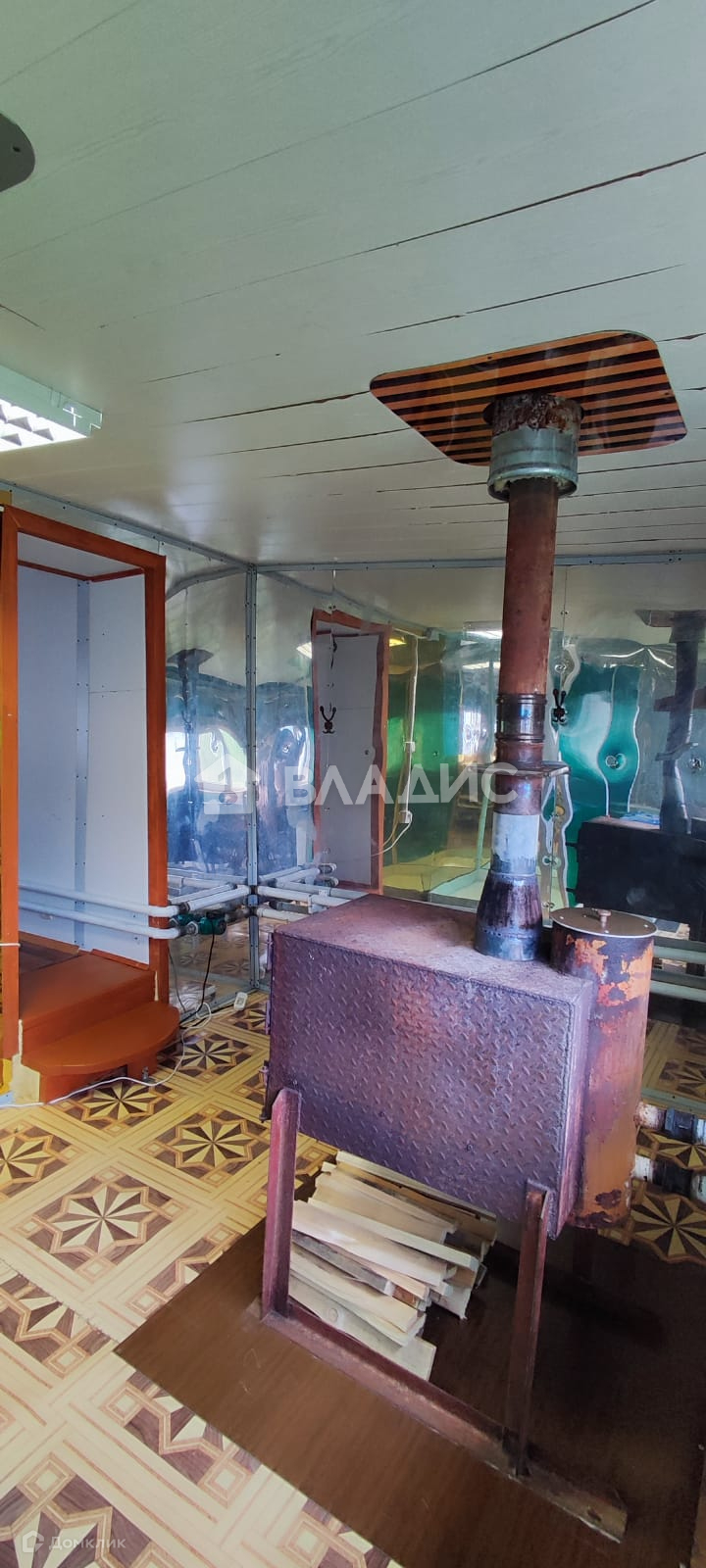 Дом рубленный (елка), отделан улица - пластик, внутри - отделочный оргалит, полы доска елка 500 мм.