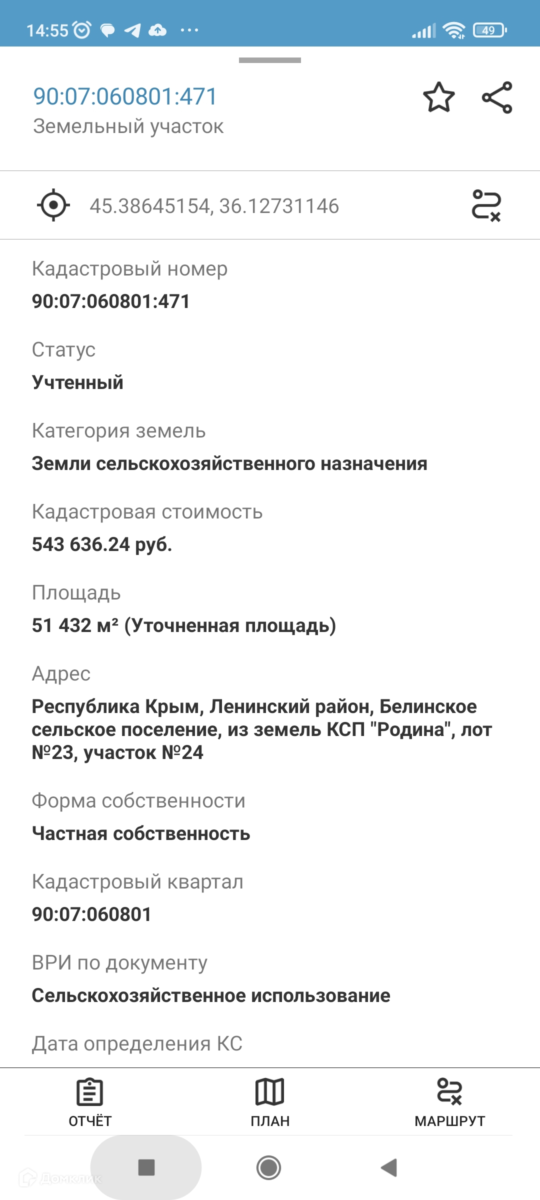 Кадастровый номер 90:07:060801:471, категория земель - Земли сельскохозяйственного назначения, вид разрешенного использования - Сельскохозяйственное использование, межевание проведено, документы РФ. Расположен участок на территории Белинского сельского поселения из земель КСП "Родина" лот №23