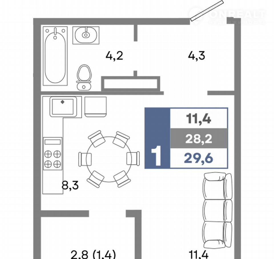 Общая площадь 29.6 м2
